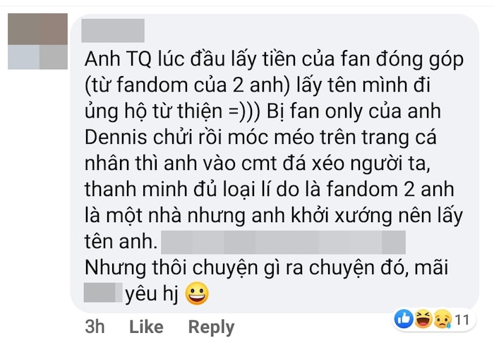 Cụ thể, trong một bài đăng về bộ đôi này trên mạng xã hội, một tài khoản đã vào để lại bình luận với nội dung: “Anh Trung Quân lúc đầu lấy tiền của fan đóng góp (từ fandom của 2 anh ấy) lấy tên mình đi ủng hộ từ thiện. Bị fan only của anh Denis chửi rồi móc méo trên trang cá nhân thì anh vào comment đá xéo người ta, thanh minh đủ loại lí do là fandom 2 anh là một nhưng anh khởi xướng nên lấy tên anh“.