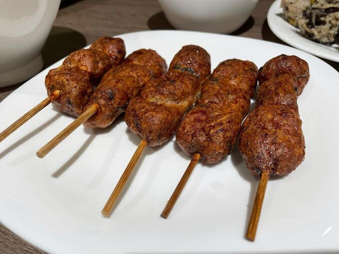 _Nắn phần nguyên liệu vừa trộn thành từng viên dài khoảng 10cm, ghim chúng vào những chiếc que đã chuẩn bị.