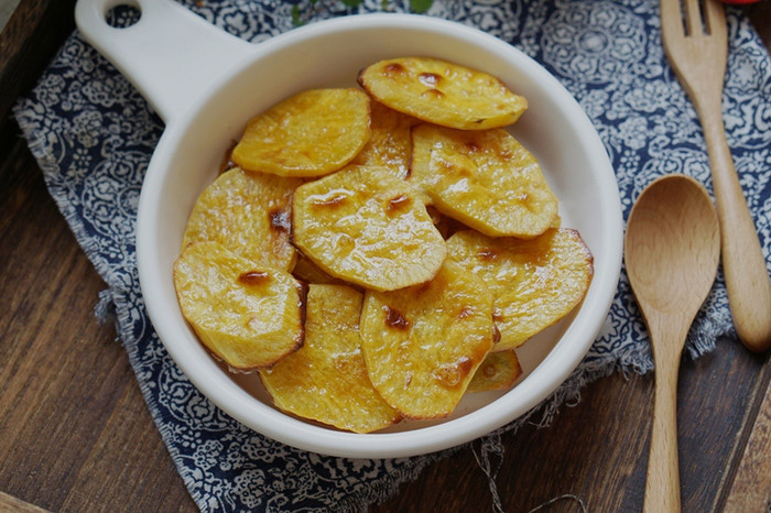 Đun dầu nóng, cho khoai vào chiên vàng giòn rồi vớt ra để ráo dầu.