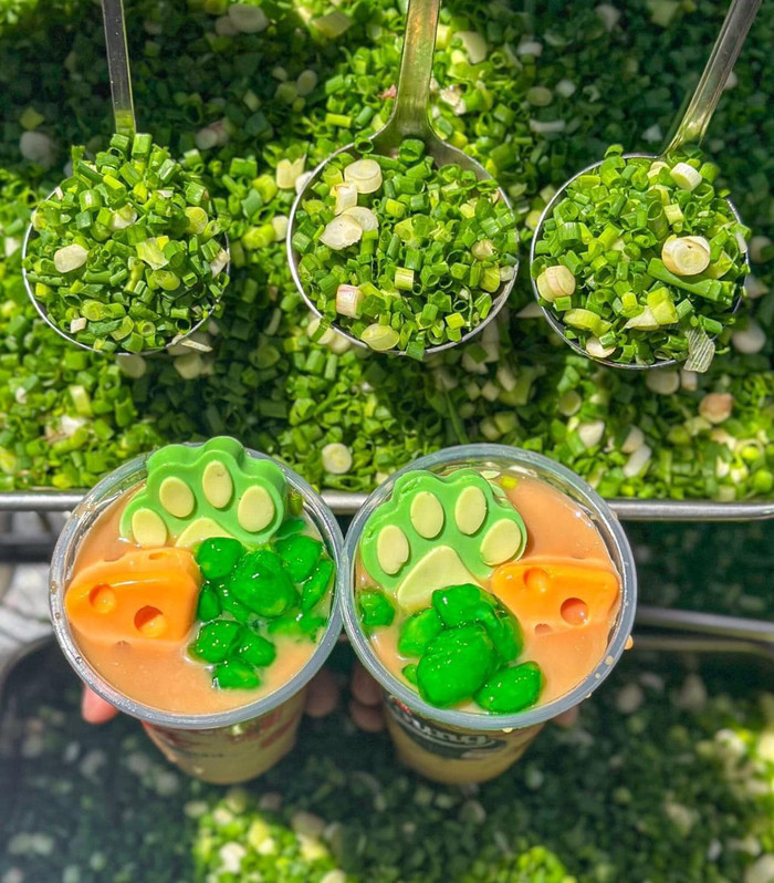 Quán này cho biết: "Ủa tưởng giỡn mà tiệm bán thiệt bây ơi: Trà sữa hành lá thơm phức. Ly trà full topping phô mai, củ năng, chân mèo thơm béo bình thường. Topping hành lá để riêng, ai muốn trải nghiệm thì cho vào nha".