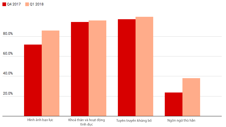 Những con số Facebook chia sẻ lần này chủ yếu tập trung vào những loại nội dung xấu chính. Công ty này đã gỡ bỏ 21 triệu bài đăng liên quan đến “hình ảnh khỏa thân của người trưởng thành hoặc nội dung khiêu dâm,” ví dụ, hầu hết số này được tự động phát hiện bằng thuật toán phần mềm. Facebook cũng gỡ bỏ 2,5 triệu bài đăng có nội dung “ngôn ngữ thù hận”, tăng 56% từ con số 1,6 triệu bài đăng trong Quý IV năm ngoái.