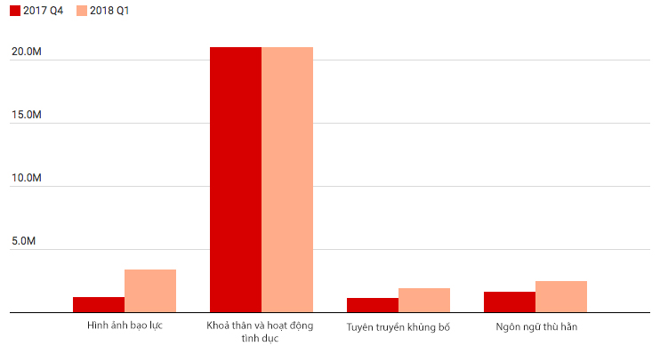 Số lượng bài đăng xấu Facebook gỡ xuống, phân chia theo loại nội dung (đơn vị: triệu).