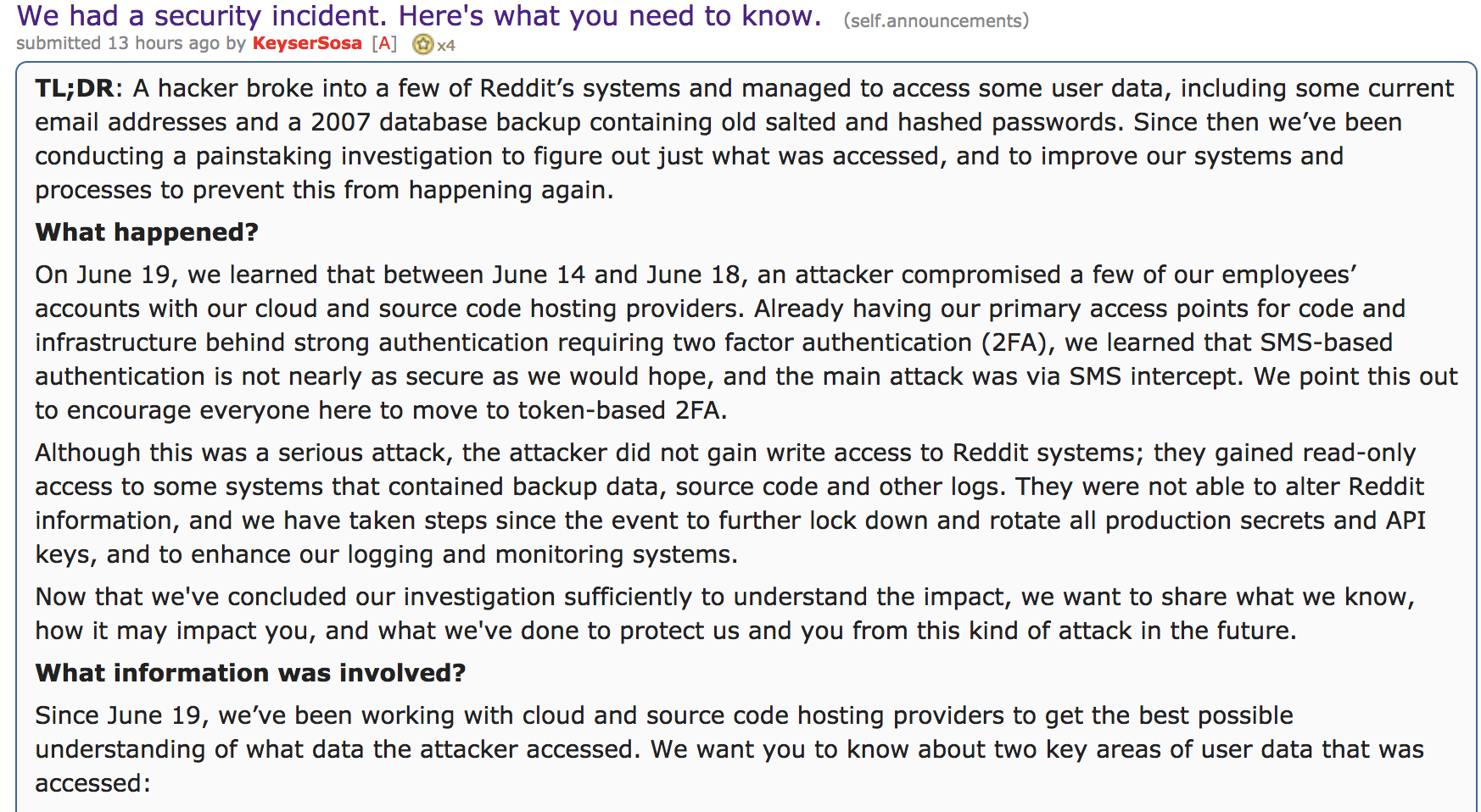 Theo CTO Christopher Slowe, khi một nhân viên của Reddit sử dụng phương thức bảo mật xác thực hai lớp (two-factor authentication) được gửi qua tin nhắn SMS, hacker đã tiếp cận thiết bị di động để chặn các tin nhắn này và truy cập vào tài khoản nhân viên Reddit.