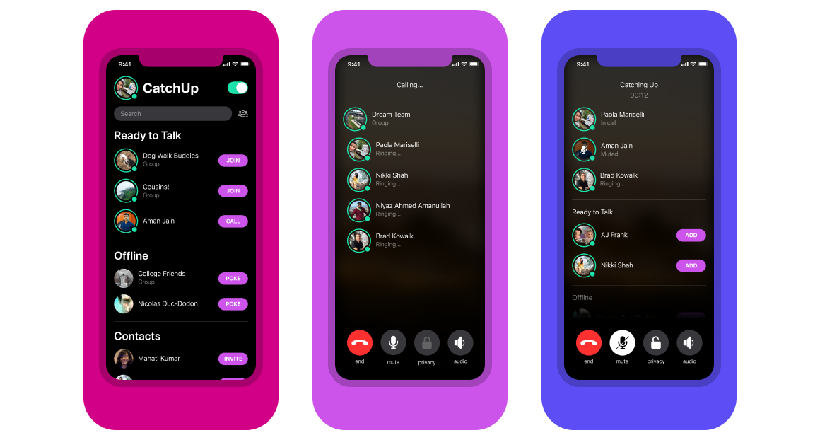 Nhóm nghiên cứu và phát triển nội bộ của Facebook (NPE Team) mới đây đã ra mắt một ứng dụng mới gọi là CatchUp với khả năng giúp người dùng Mỹ thực hiện các cuộc điện thoại dễ dàng hoặc thực hiện cuộc gọi nhóm với sự tham gia của tối đa 8 người.