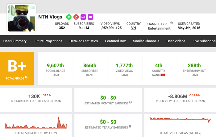 Cụ thể, ghi nhận từ Social Blade, chuyên trang thống kê uy tín chuyên theo dõi hoạt động của các tài khoản mạng xã hội và YouTube, cho thấy số tiền ước tính trên kênh NTN Vlogs kiếm được ở thời điểm hiện tại đang là 0 đồng.