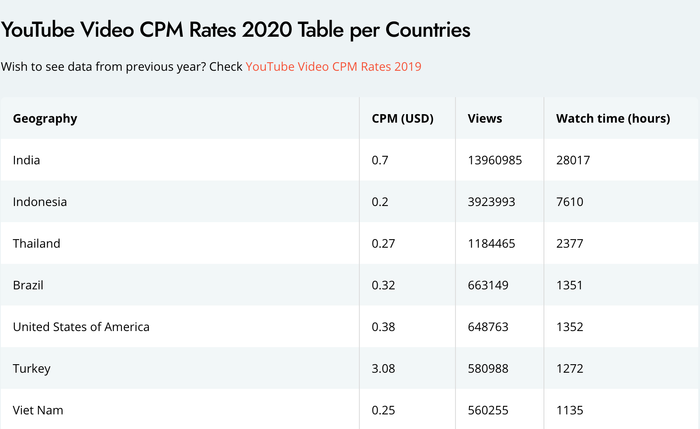 Theo thống kê từ Bannertag, chỉ số CPM (giá tiền trả cho mỗi 1000 lượt xem video đính kèm quảng cáo) tại Việt Nam đang rơi vào khoảng 0,25 USD. Nghĩa là, các nhà sáng tạo sẽ kiếm được 250 USD nếu video đạt 1 triệu lượt xem.