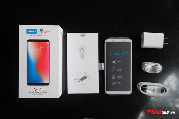 Bên trong hộp máy, người dùng có chiếc Vivo V7, sách hướng dẫn sử dụng, que chọc SIM, tai nghe, cáp sạc và cục sạc.