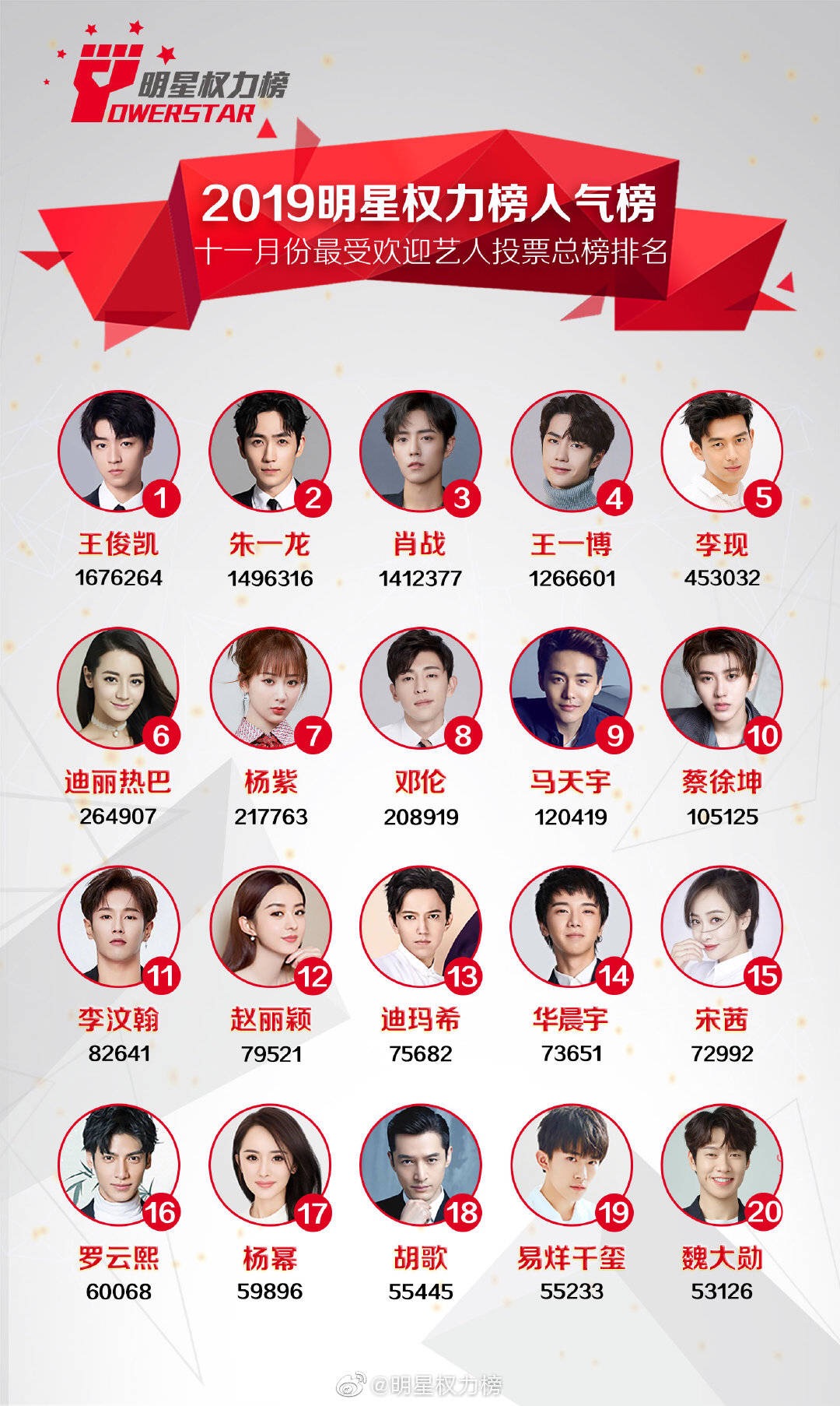 Vào ngày 05/12, Powerstar ở Weibo đã công bố kết quả bỏ phiếu từ cộng đồng người hâm mộ, cư dân mạng trực tuyến cho hạng mục Ngôi sao quyền lực nhất được yêu mến nhất tháng 11 năm 2019. Được biết, kết quả xếp hạng dựa vào tổng số phiếu bầu từ cư dân mạng dành cho nghệ sĩ mình yêu mến nhất ở nhiều quốc gia trong khu vực châu Á.