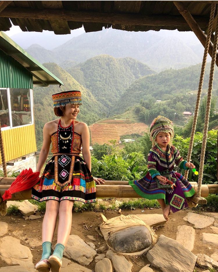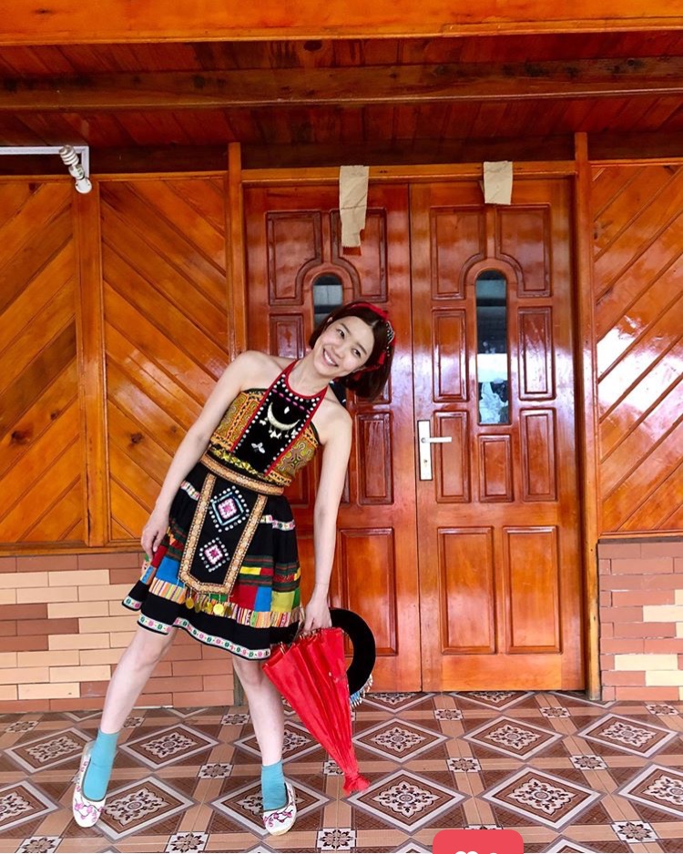 Ngày 12/05, Shin Da Eun trải nghiệm với bộ trang phục thổ cẩm xinh xắn ở bản làng Cát Cát, nữ diễn viên đăng ảnh kèm chú thích: “Làng Cát Cát - công chúa nhỏ và..”.