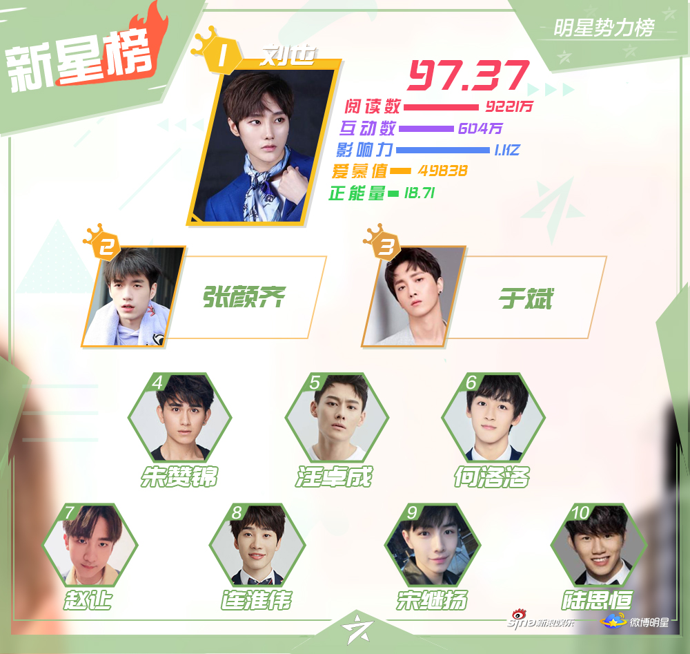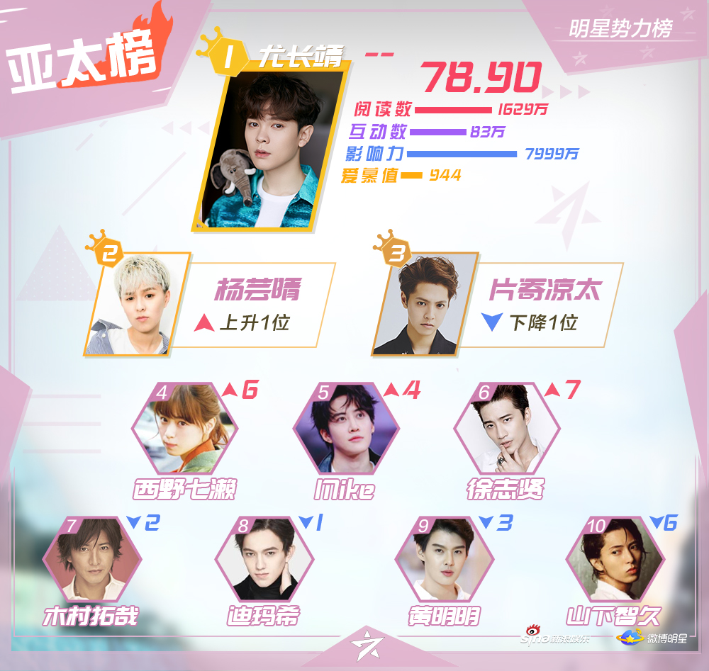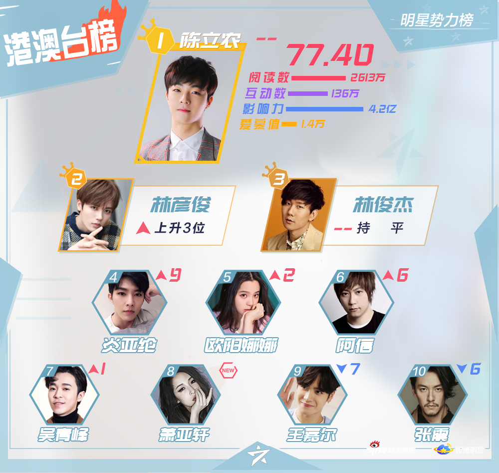 Ngày 27/08 vừa qua, Sina Entertainment đã công bố Top 10 những nghệ sĩ nổi tiếng, hiện đang hoạt động ở khu vực Đại Lục Trung Quốc, Hong Kong, Macao - Đài Loan, các quốc gia châu Á - Thái Bình Dương và châu Âu - Hoa Kỳ trên mạng xã hội Weibo.