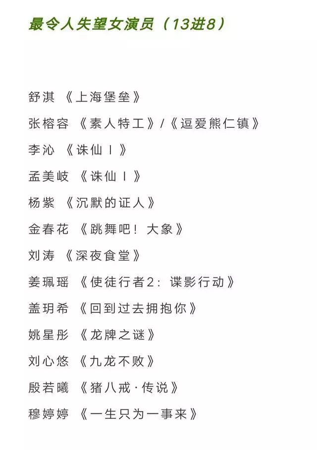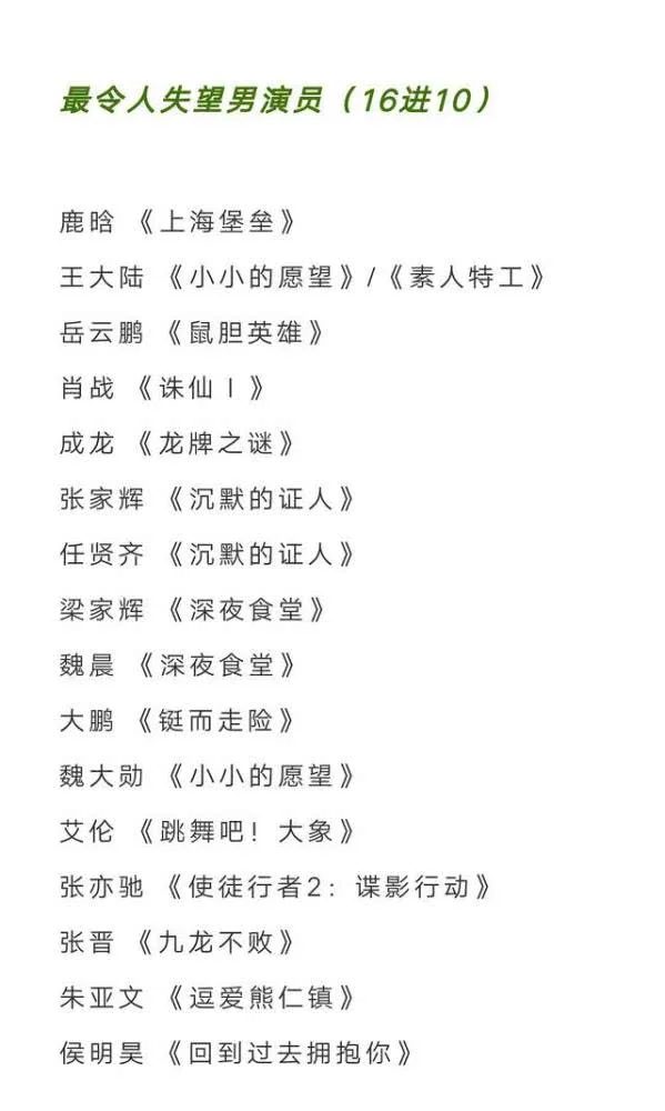 Nếu như trong đề cử xuất hiện những cái tên lưu lượng không khiến nhiều người bất ngờ lắm thì năm nay dàn thực lực như Thư Kỳ hay như “đại ca” Thành Long cũng không thoát khỏi với “phim nhảm” Long bài chi mê. Nhân chứng thầm lặng vào thời điểm công chiếu không mang được thành tích tốt, dẫn đến những cái tên ảnh đế như Trương Gia Huy, Nhậm Hiền Tề... hay nữ diễn viên được đánh giá có năng lực và được yêu thích ở mảng truyền hình như Dương Tử cũng có một vé ở nơi đây.