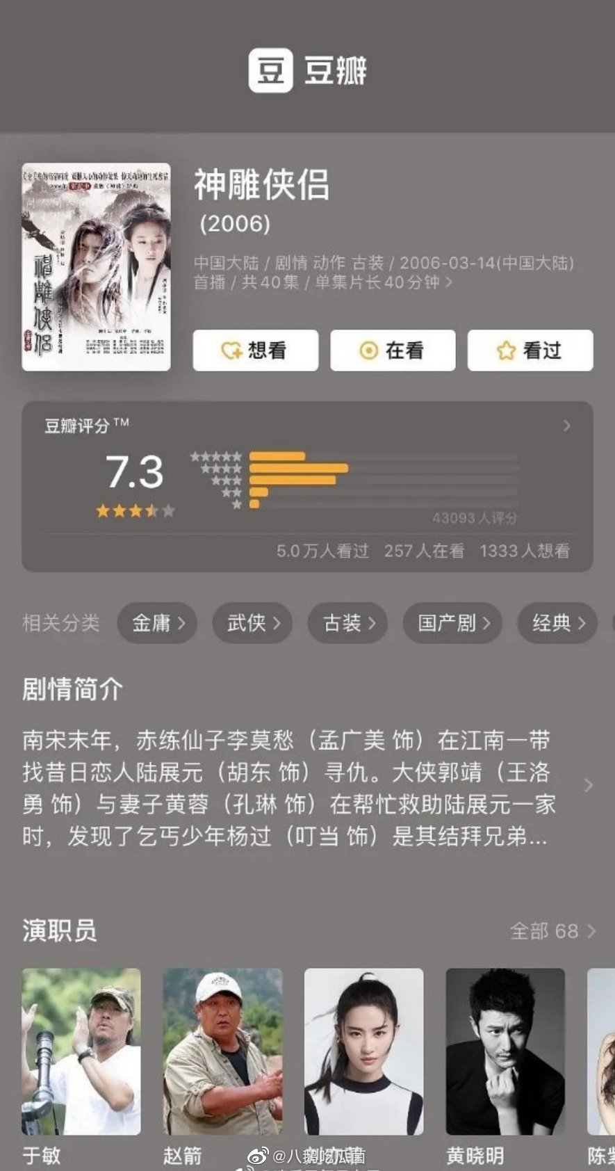 Các bộ phim đó gồm Kim phấn thế gia với 8.4 điểm, Thiên long bát bộ với 8.3 điểm, Tiên kiếm kỳ hiệp với 8.9 điểm và Thần điêu đại hiệp 7.3 điểm.