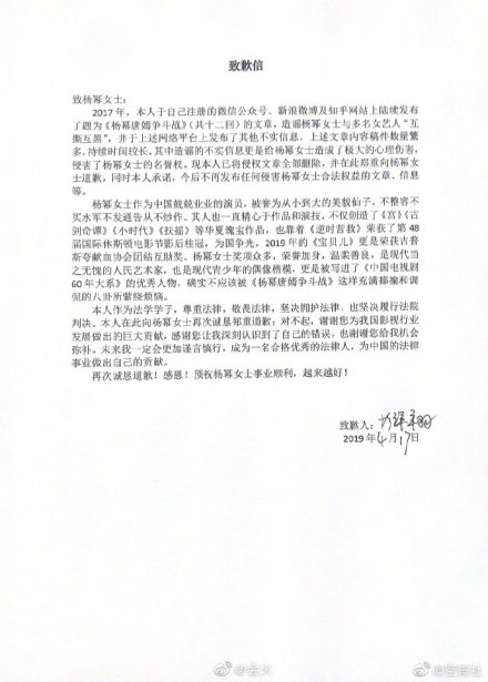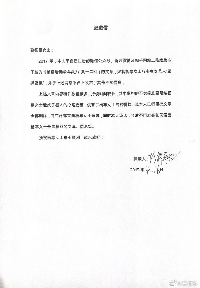 Ngày 18 tháng 4 hôm nay, một tài khoản truyền thông - Không Thanh xã đã gởi thư xin lỗi đến Dương Mịch đồng thời biểu thị: “Bức thư xin lỗi này đã thông qua sự chỉnh sửa của toà án, và được họ đích thân gởi lại cho tôi sau khi đã thông qua chỉnh sửa. Chủ yếu thể hiện bản thân với thái độ xin lỗi thành khẩn cũng như tham khảo ý kiến của phía công ty Dương Mịch”.
