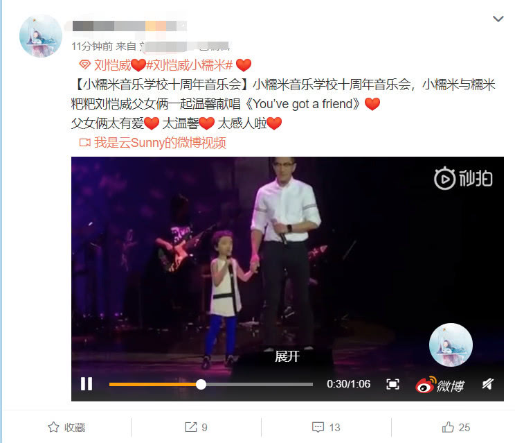 Ngày 16 tháng 7, có cư dân mạng đăng tải lên hình ảnh Lưu Khải Uy cùng con gái song ca bài hát tiếng anh You’ve got a friend trên sân khấu. Đêm đó là buổi âm nhạc kỷ niệm 10 năm của trường Tiểu Gạo Nếp, sự xuất hiện của hai cha con đã trở thành tiêu điểm, thu hút nhiều sự chú ý của truyền thông Hong Kong.