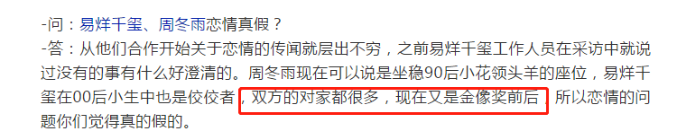 Dịch Dương Thiên Tỉ cũng vậy, chỉ mới hợp tác một tác phẩm với Châu Đông Vũ đã gặp phải nhiều tin đồn như vậy, từ trong phim kéo ra đến ngoài đời thực, thử hỏi tài nguyên phim ảnh sau này phải nhận thế nào? Lẽ nào Dịch Dương Thiên Tỉ chỉ dám hợp tác với những nam diễn viên như Lôi Giai Âm, Hoàng Tử thao?