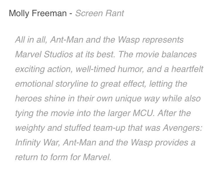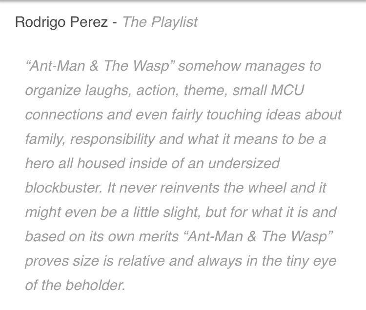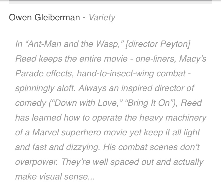 Ant-Man And The Wasp là bộ phim do Peyton Reed ngồi ghế đạo diễn, và theo như những phản hồi từ phía khán giả thì có lẽ Peyton Reed đã rất quyết tâm trong việc đưa dự án lần này lên một tầm cao mới so với phần một. Sau đây sẽ là một vài đánh giá, nhận xét của giới truyền thông, phê bình phim về tác phẩm này.