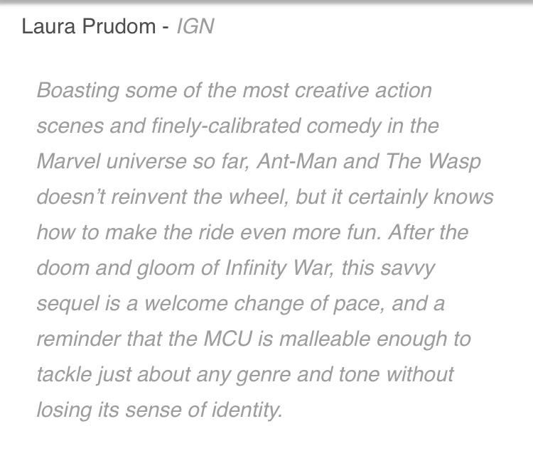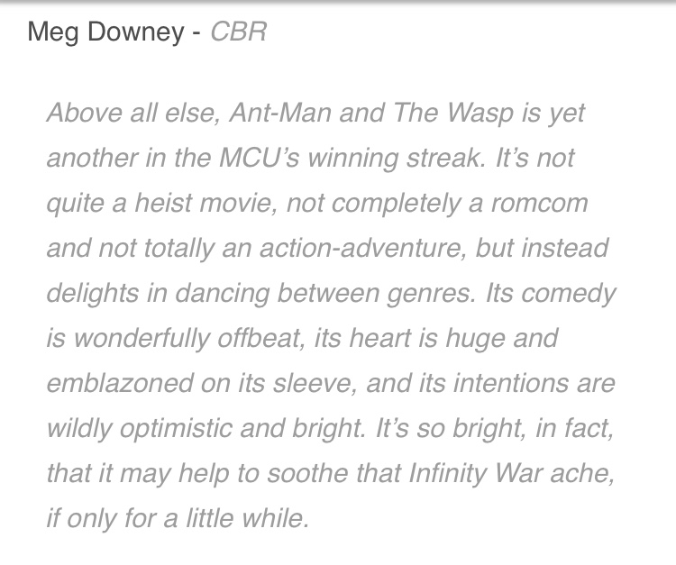 Trên tất cả, Ant-Man And The Wasp chính là thắng lợi tiếp theo của MCU. Bộ phim là sự kết hợp giữa các thể loại hình sự, lãng mạn hài hước và hành động phiêu lưu với một bầu không khí lạc quan hơn hẳn, giúp người xem được xoa dịu phần nào sau những tổn thất từ Avengers: Infinity War.