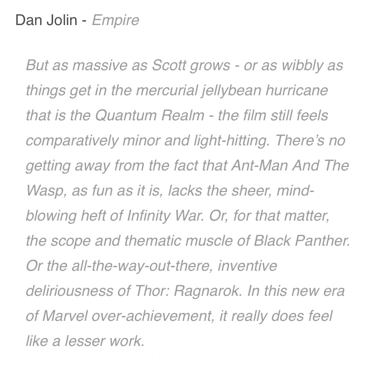Một điều nữa về Ant-Man And The Wasp là, bộ phim sẽ không cập nhập thêm diễn biến về những gì liên quan đến hai tác phẩm rất được mong đợi trong tương lai là Captain Marvel và Avengers 4. Nhìn chung, Ant-Man And The Wasp được đánh giá là một bộ phim siêu anh hùng hấp dẫn, nhẹ nhàng và có nhiều đất diễn cho những nhân vật nữ tuyệt vời đầy cá tính.