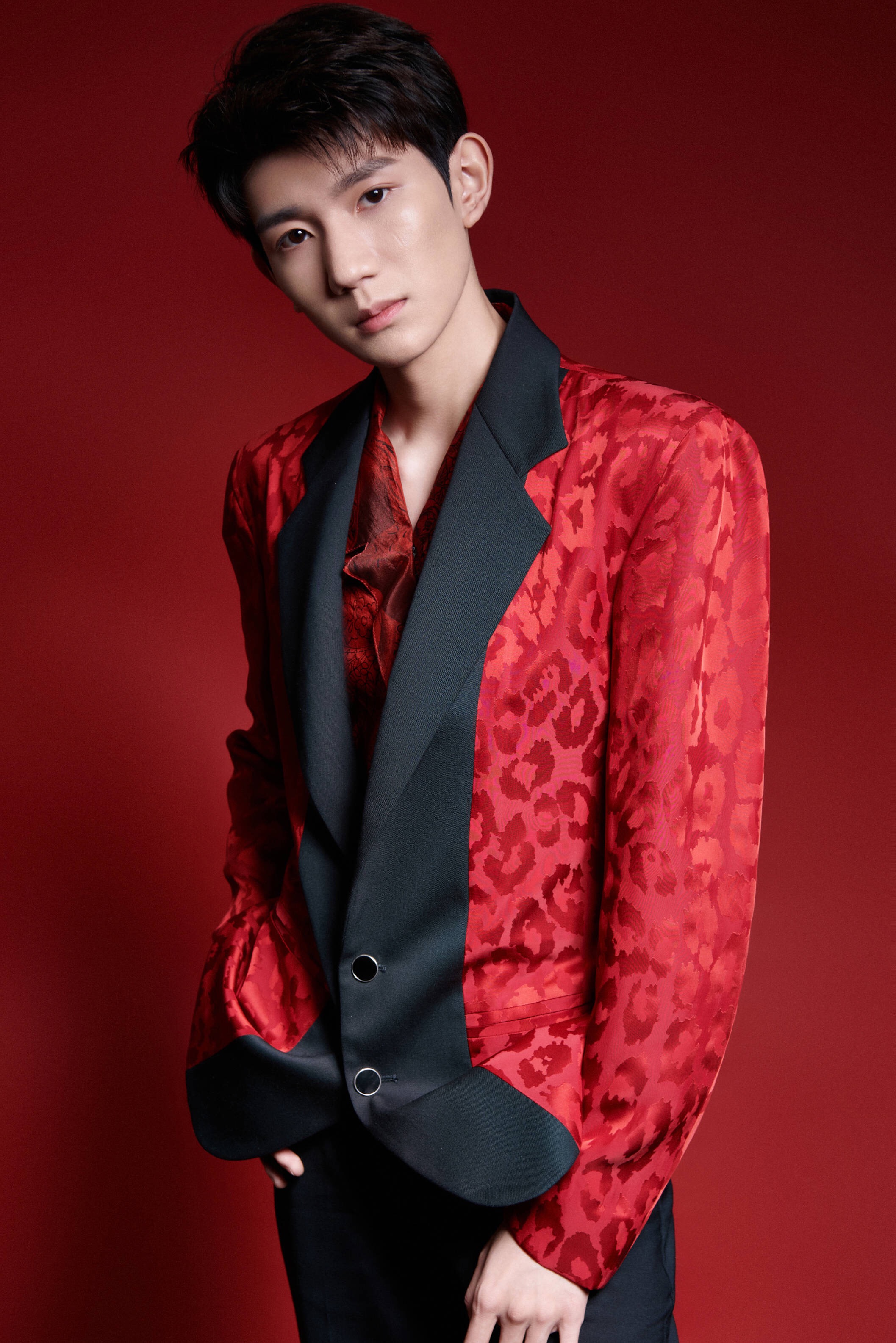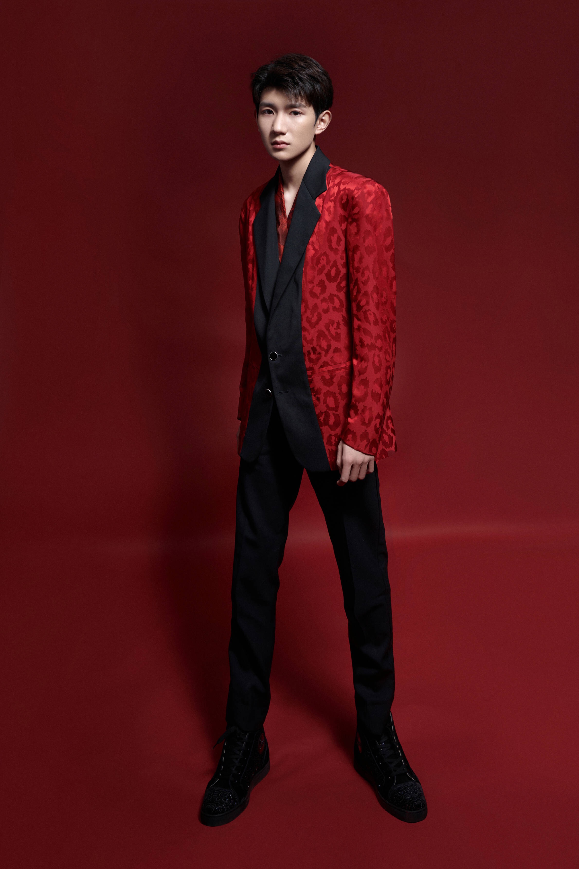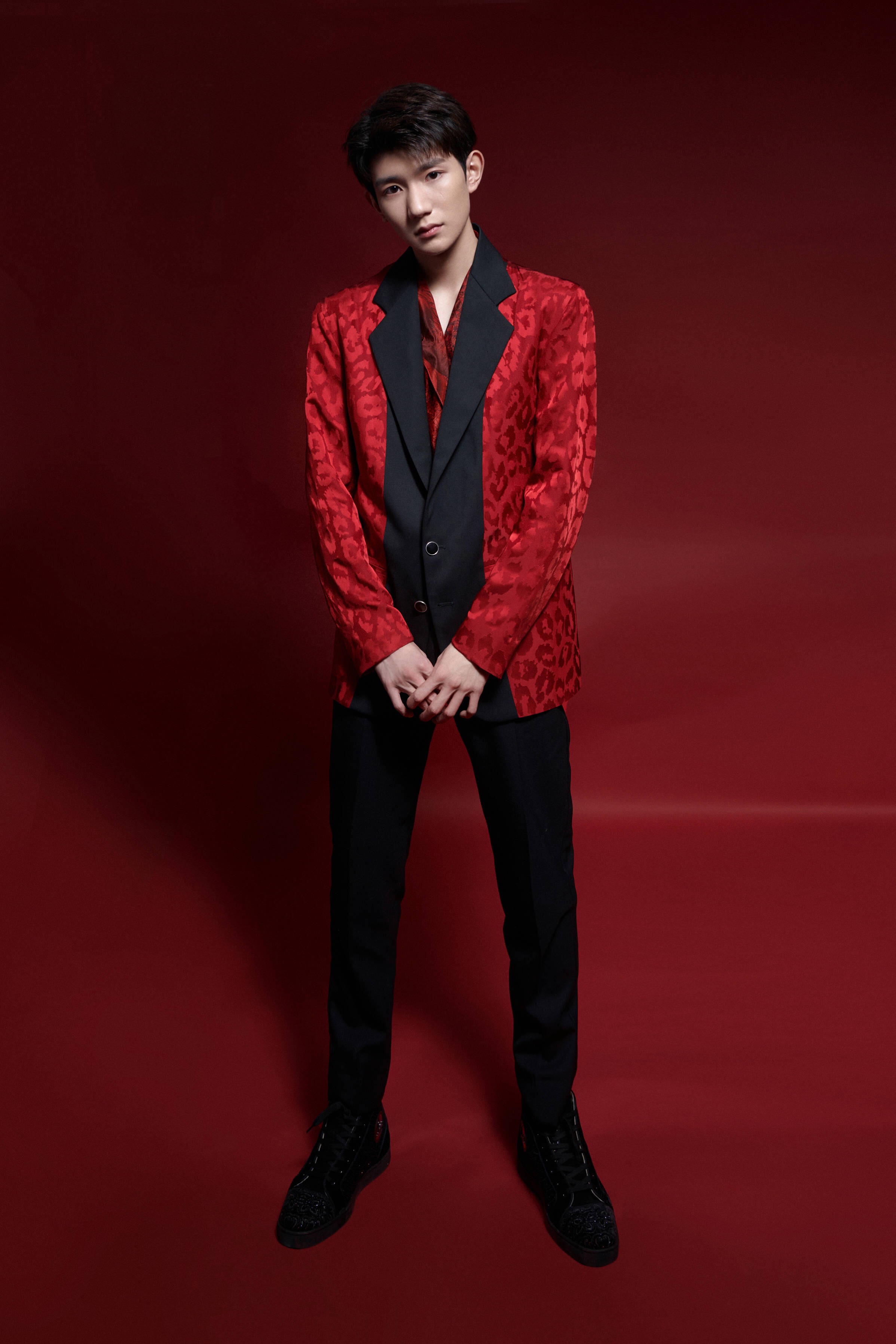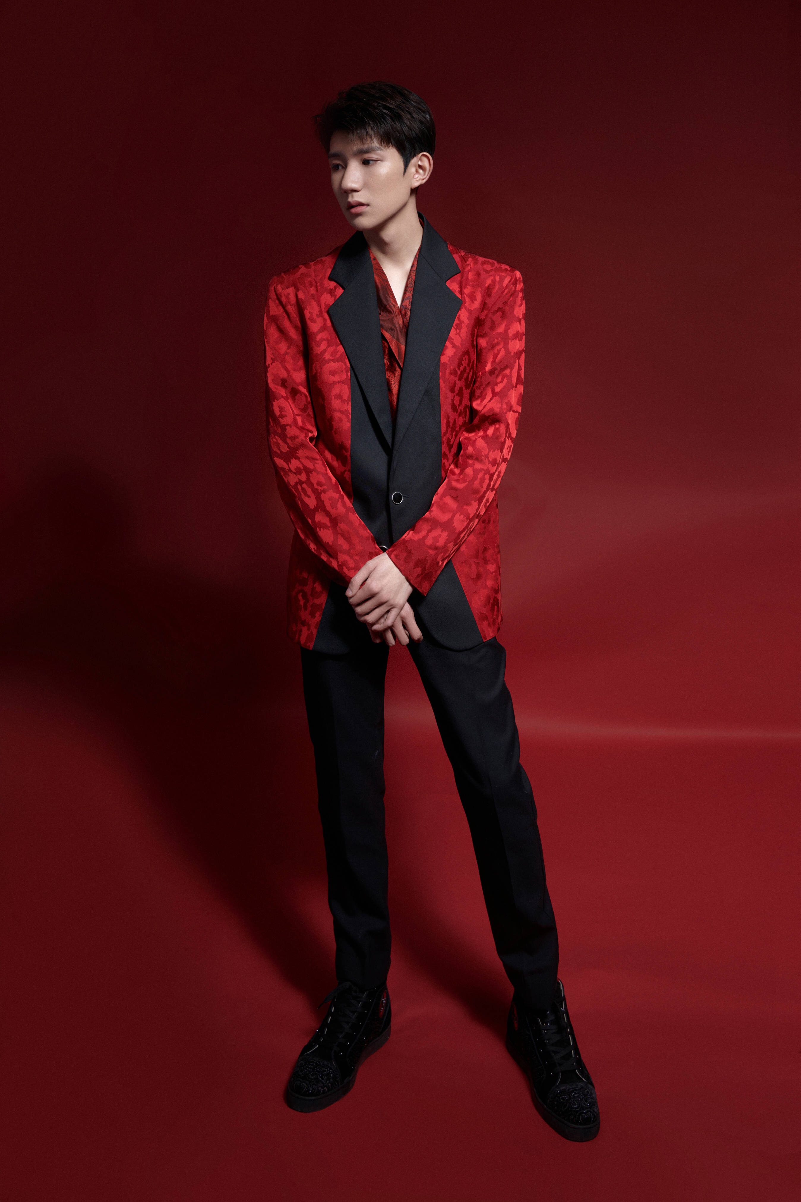 Vương Nguyên diện trên người bộ vest cổ điển màu đỏ, đen. Các yếu tố da báo màu đỏ sẫm tăng thêm sức sống cho năm mới.