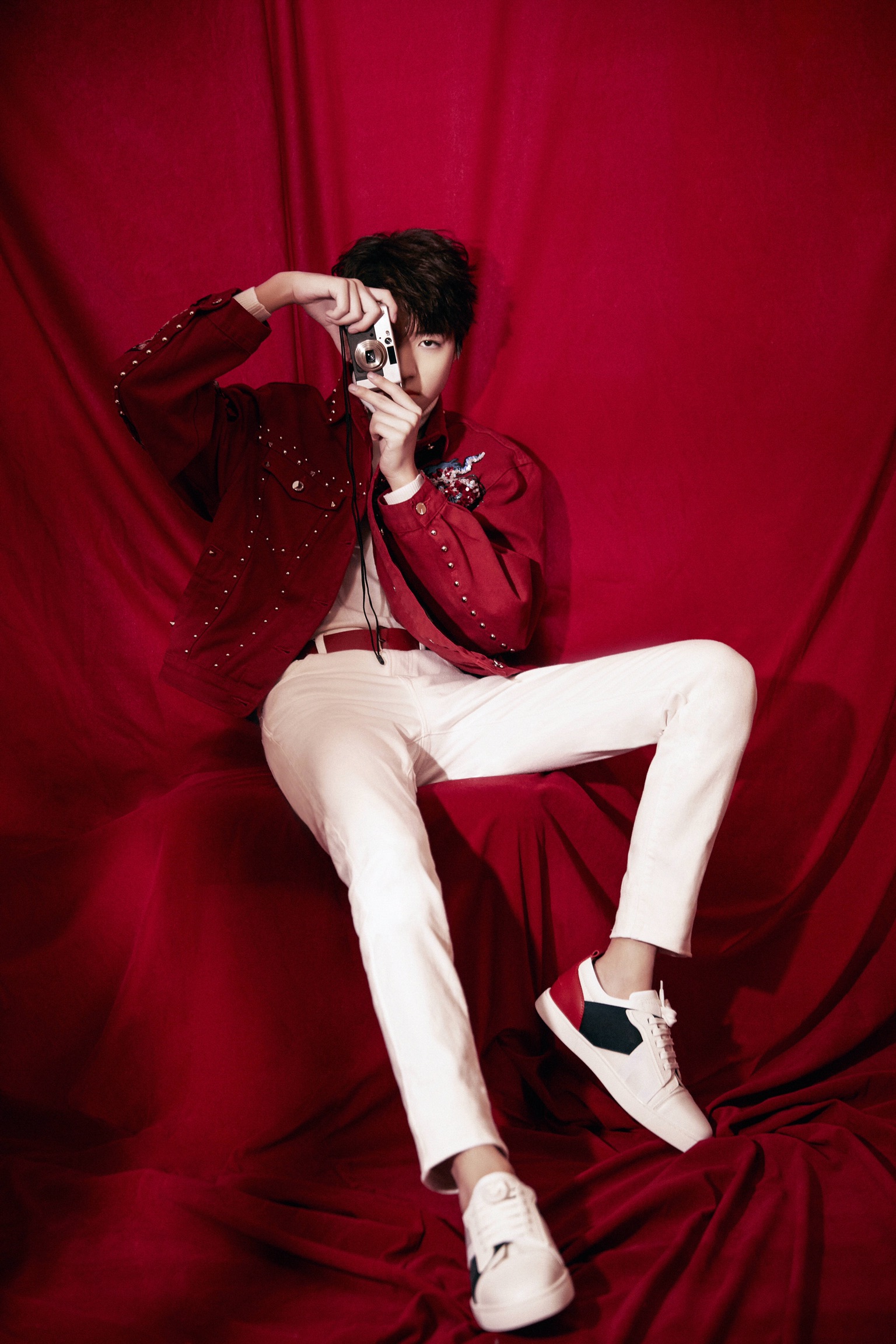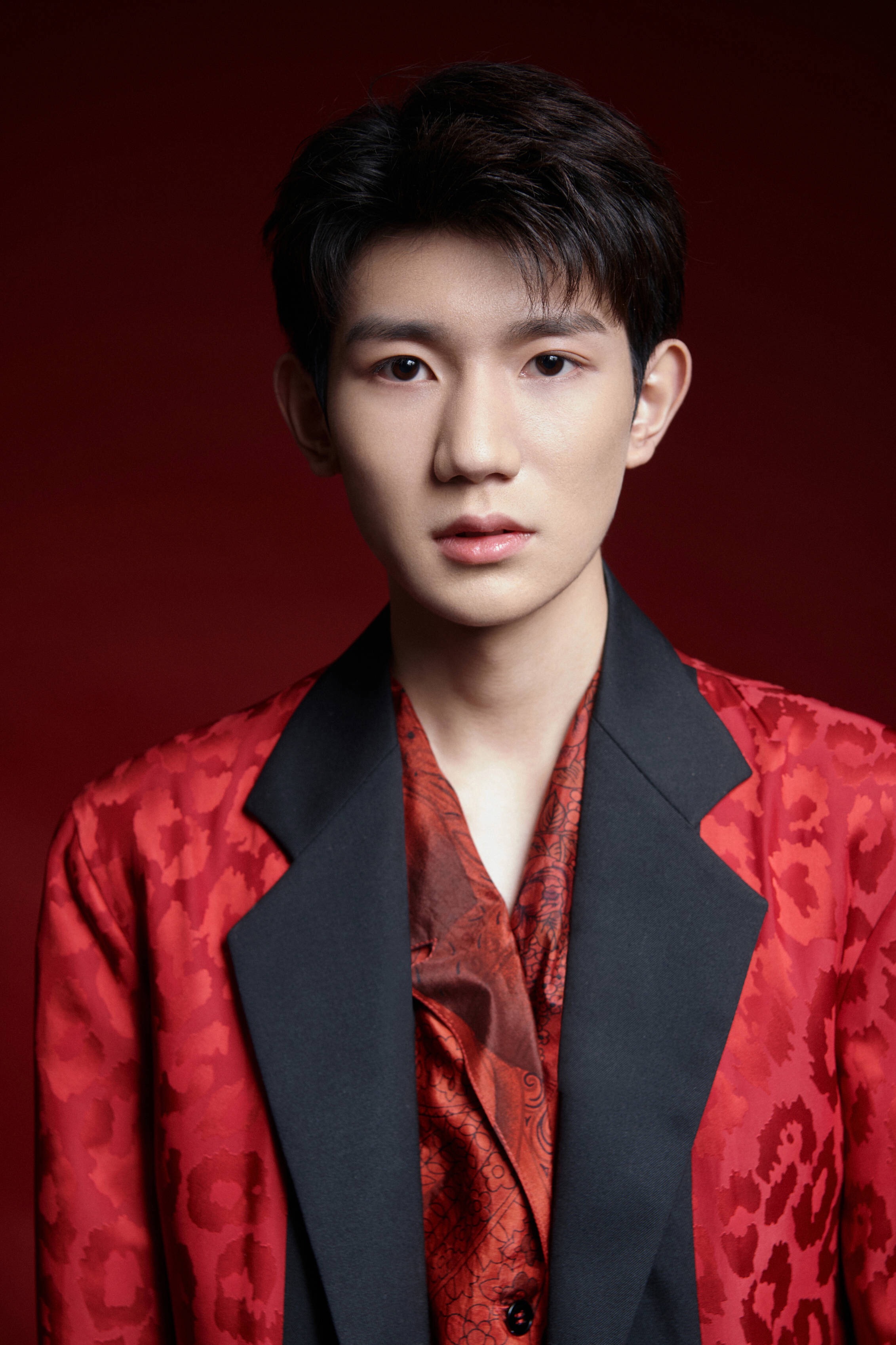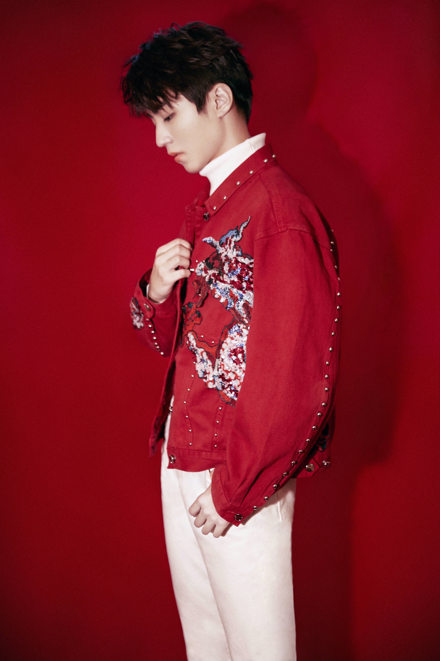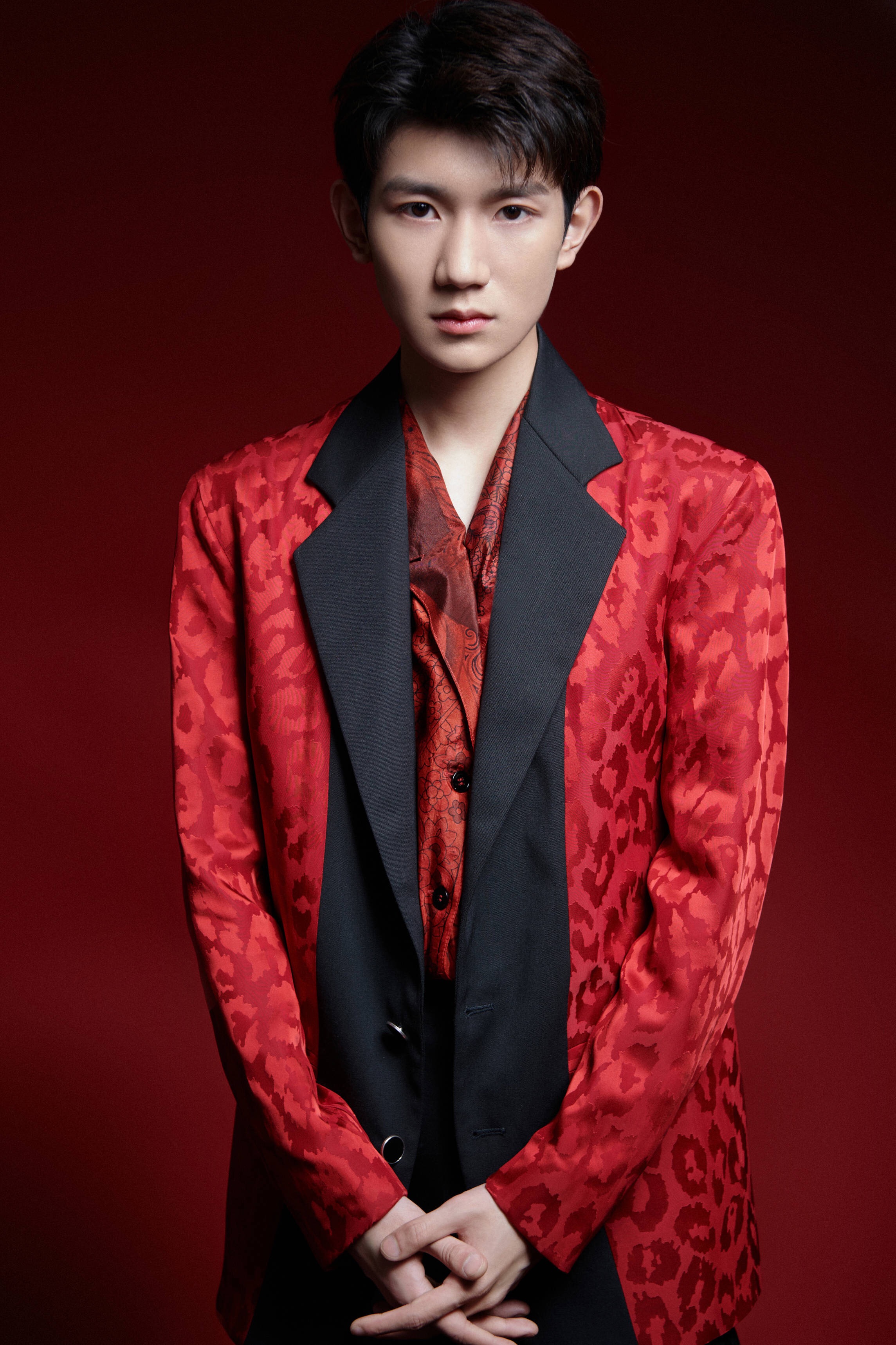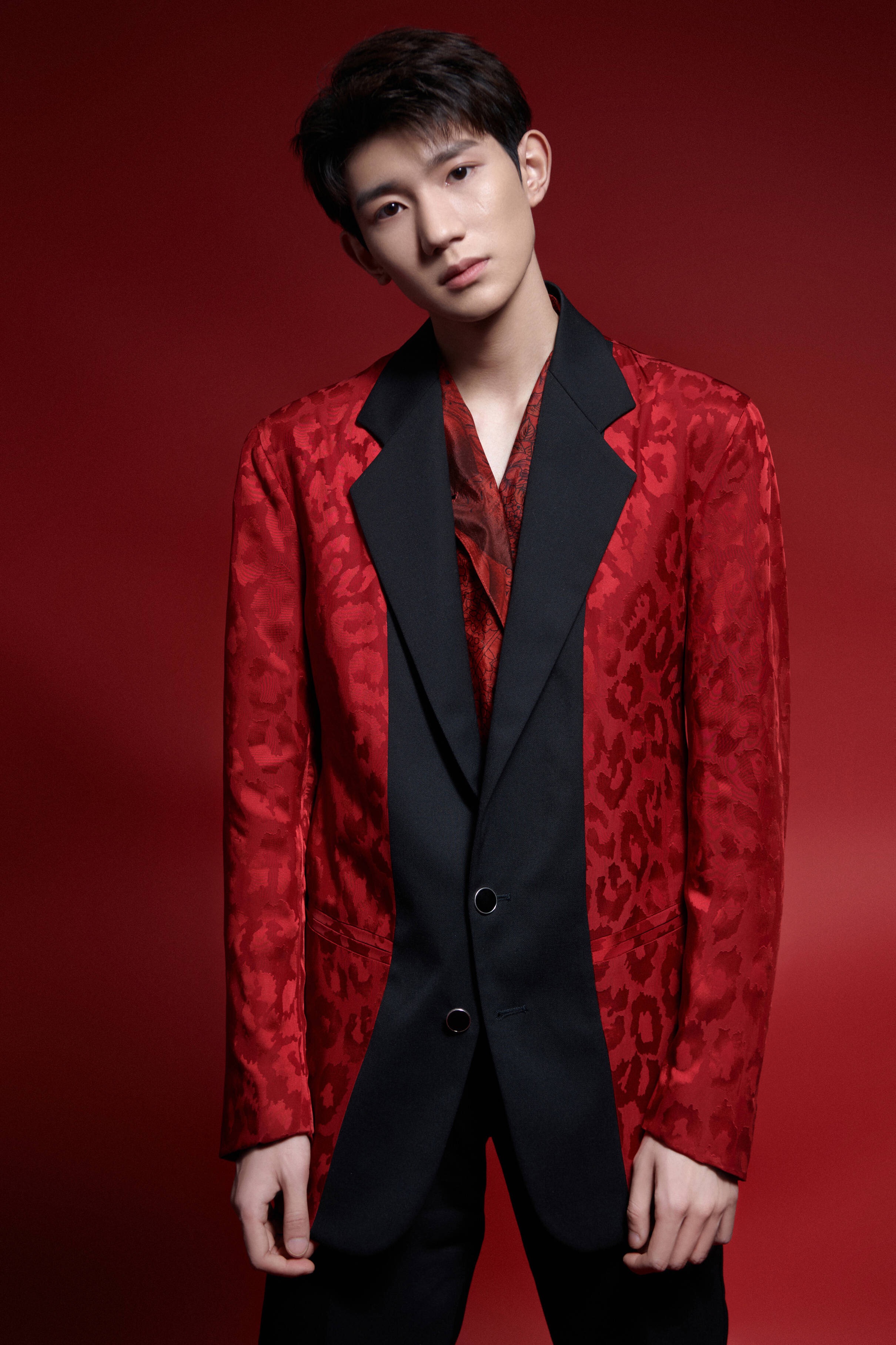 Vương Nguyên diện trên người bộ vest cổ điển màu đỏ, đen. Các yếu tố da báo màu đỏ sẫm tăng thêm sức sống cho năm mới.