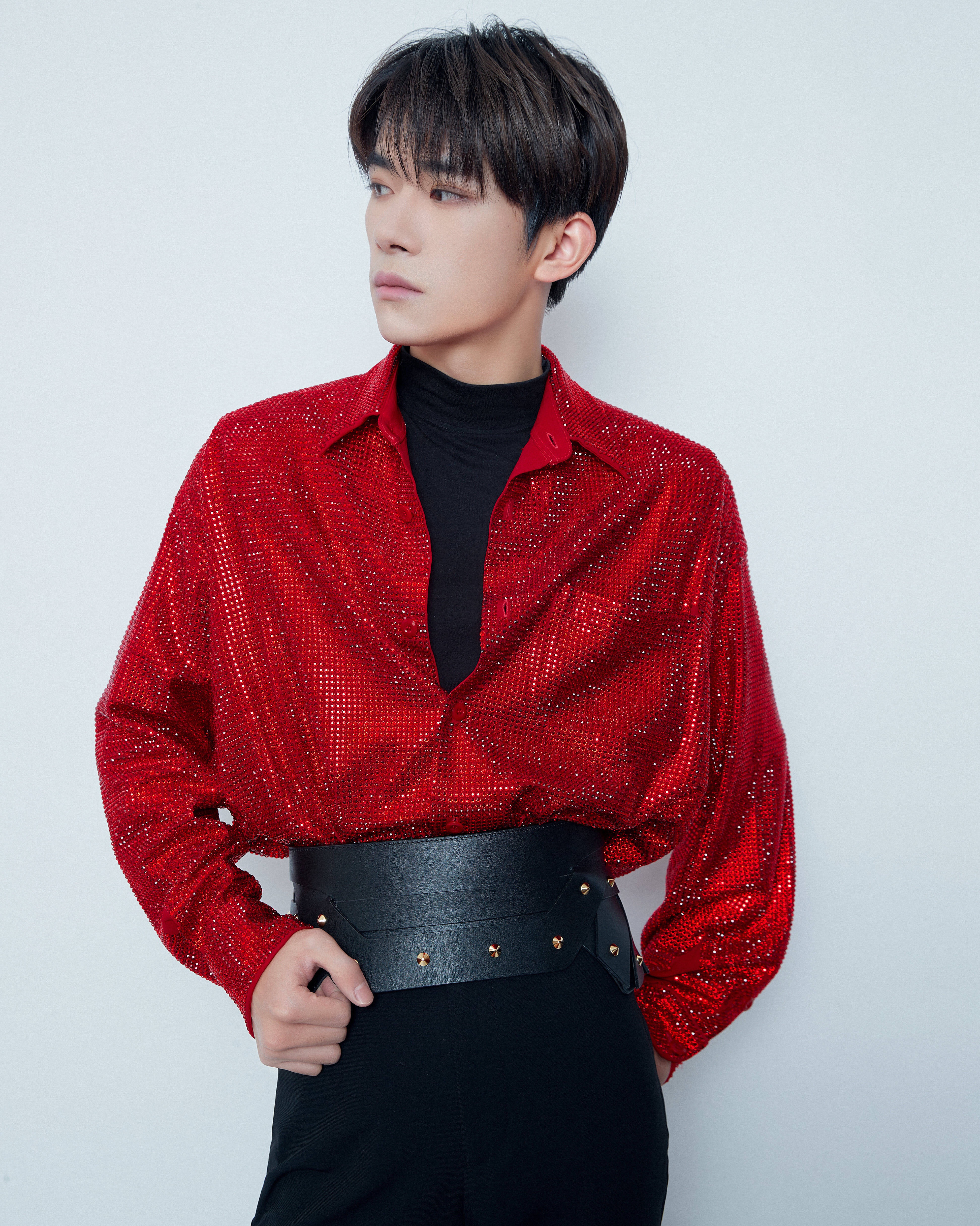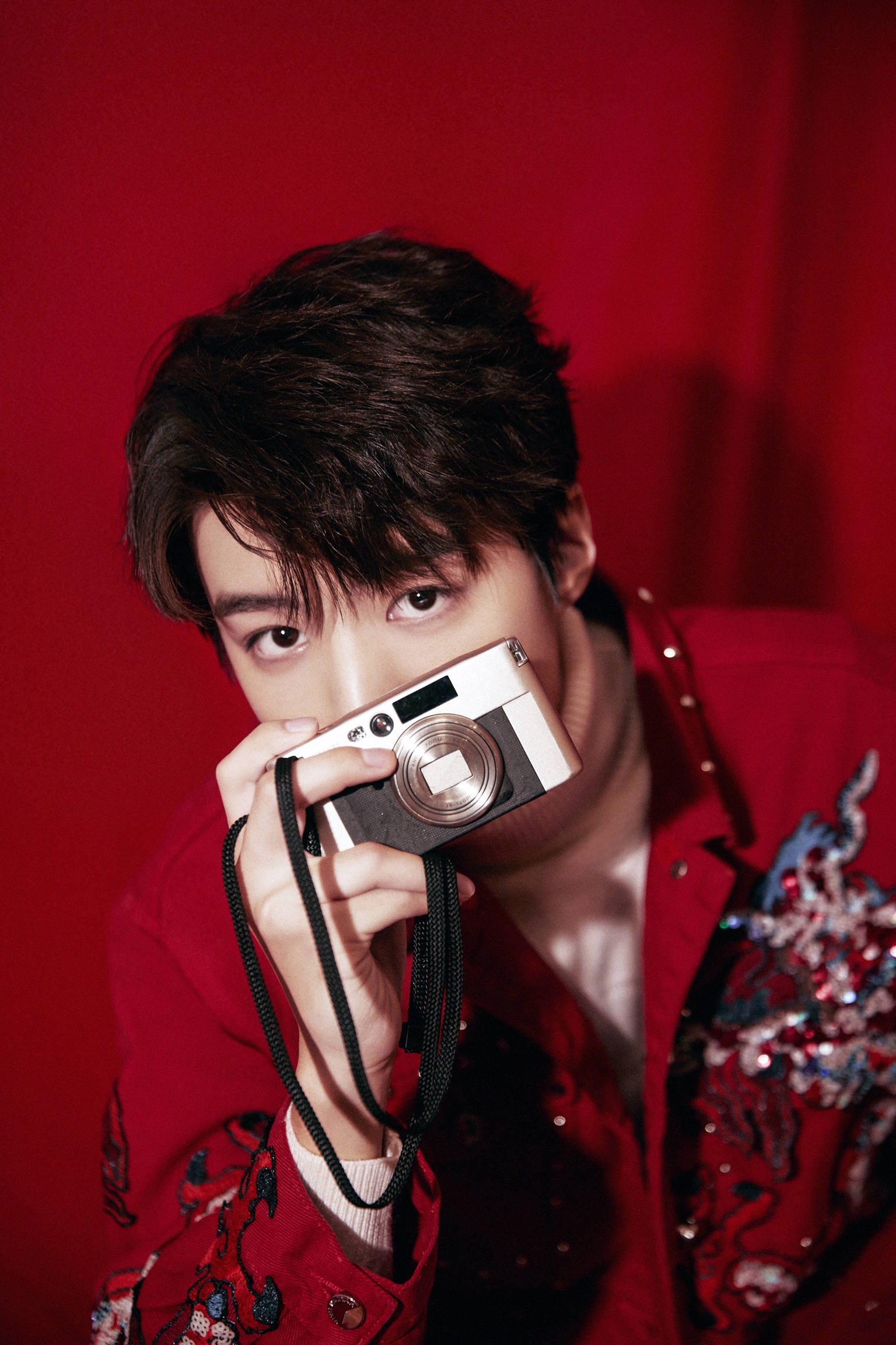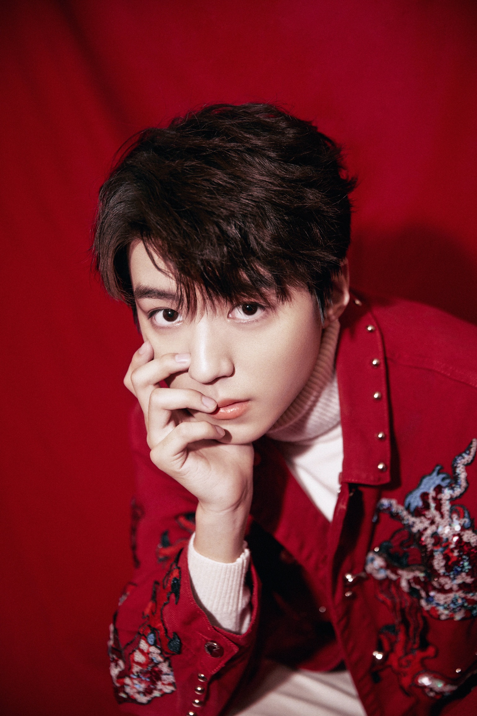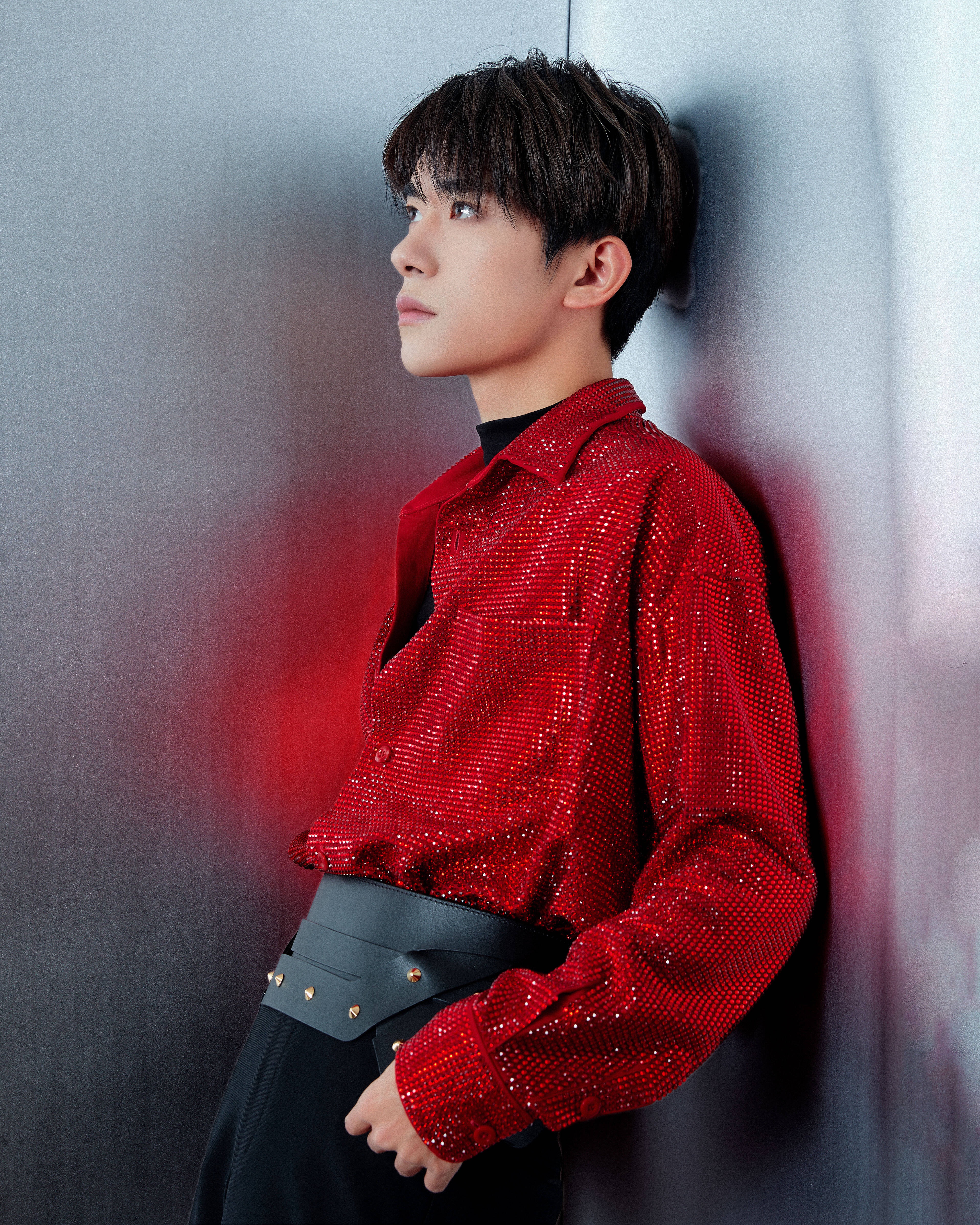 Vương Nguyên diện trên người bộ vest cổ điển màu đỏ, đen. Các yếu tố da báo màu đỏ sẫm tăng thêm sức sống cho năm mới.