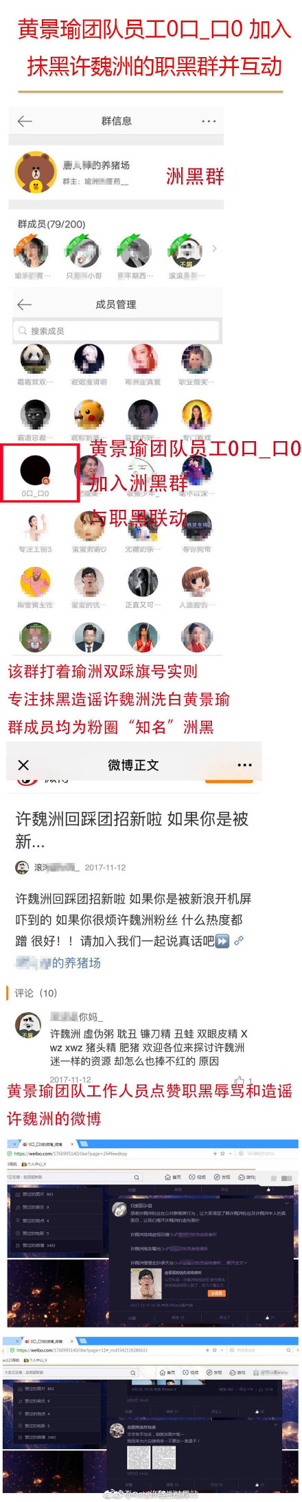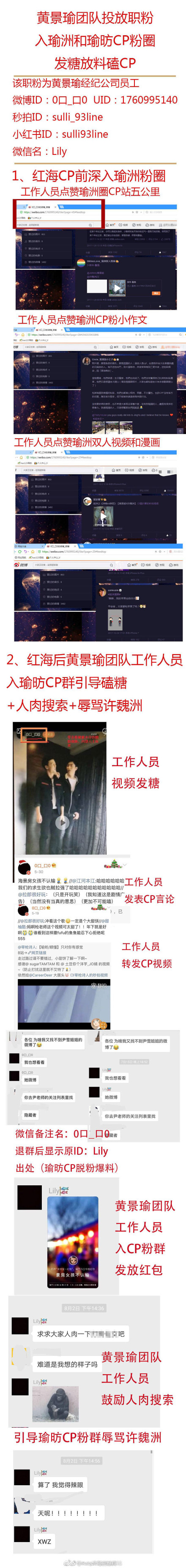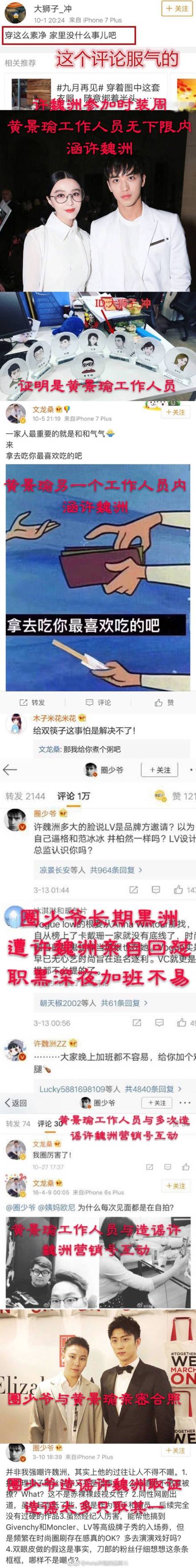 Mới đây nhất, có cư dân mạng đăng lên một bài văn dài trên weibo, phát hiện nhân viên đoàn đội của Hoàng Cảnh Du tham gia vào nhóm fan hâm mộ, cố tình, ác ý hạ bệ Hứa Ngụy Châu. Nhân viên công tác này còn chủ động đăng một số đoạn video nhằm thu hút fan couple, cố tình sao tác nam nam. Vị cư dân mạng này còn tiết lộ, tài khoản weibo của vị nhân viên này giờ đây đã xóa rồi.