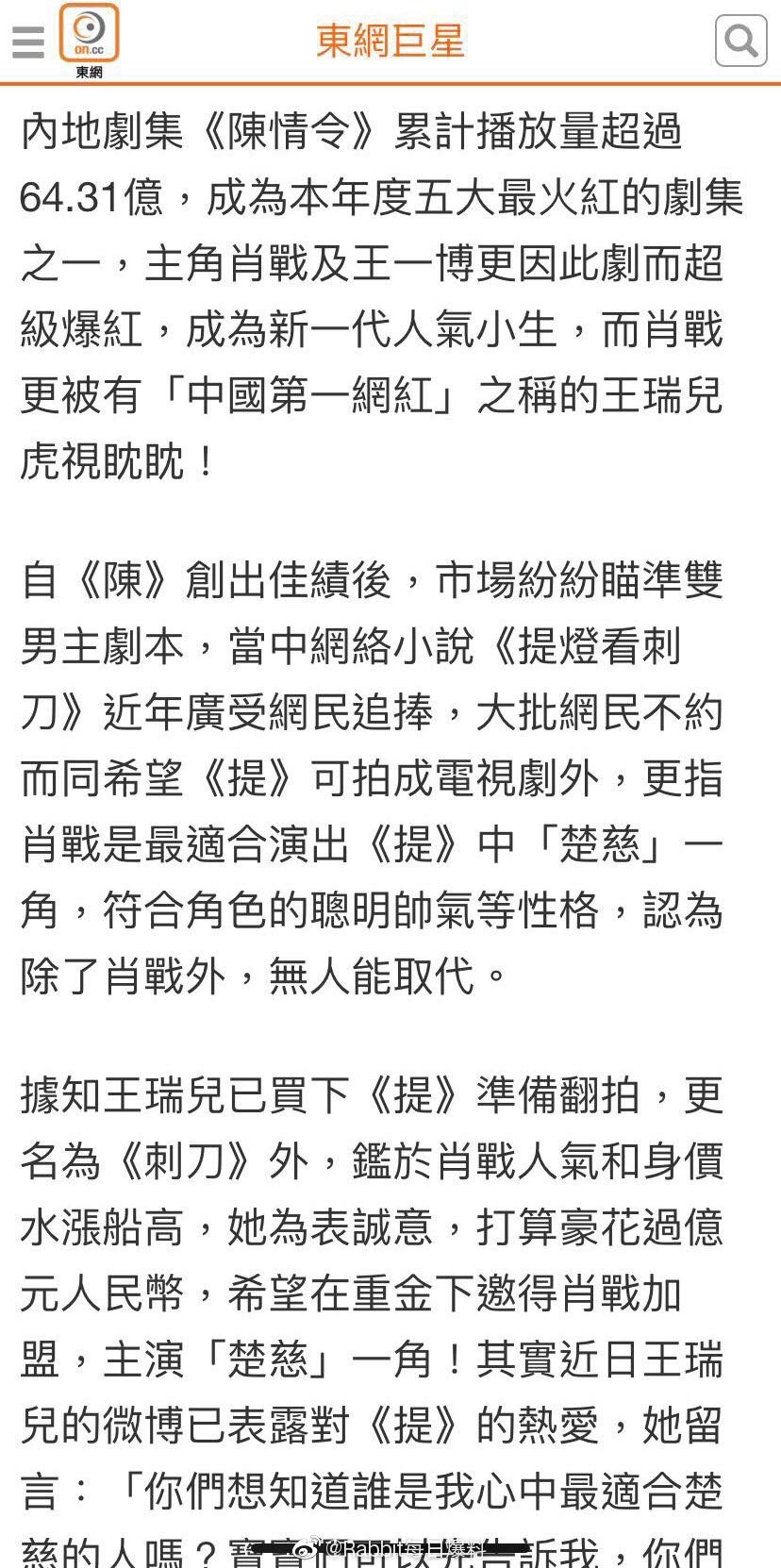 Mới đây, trên mạng xã hội Weibo xuất hiện tin hotgirl mạng Vương Thụy Nhi Natasha đã mua bản quyền của Thắp đèn ngắm lưỡi đao và có ý khởi quanh thành phim truyền hình. Và tin đáng chú ý nhất chính là Tiêu Chiến có thể sẽ tham gia vào bộ phim truyền hình lần này. Hotgirl Vương Thụy Nhi nhiều lần tiết lộ Tiêu Chiến rất thích hợp với nhân vật Sở Từ trong truyện.