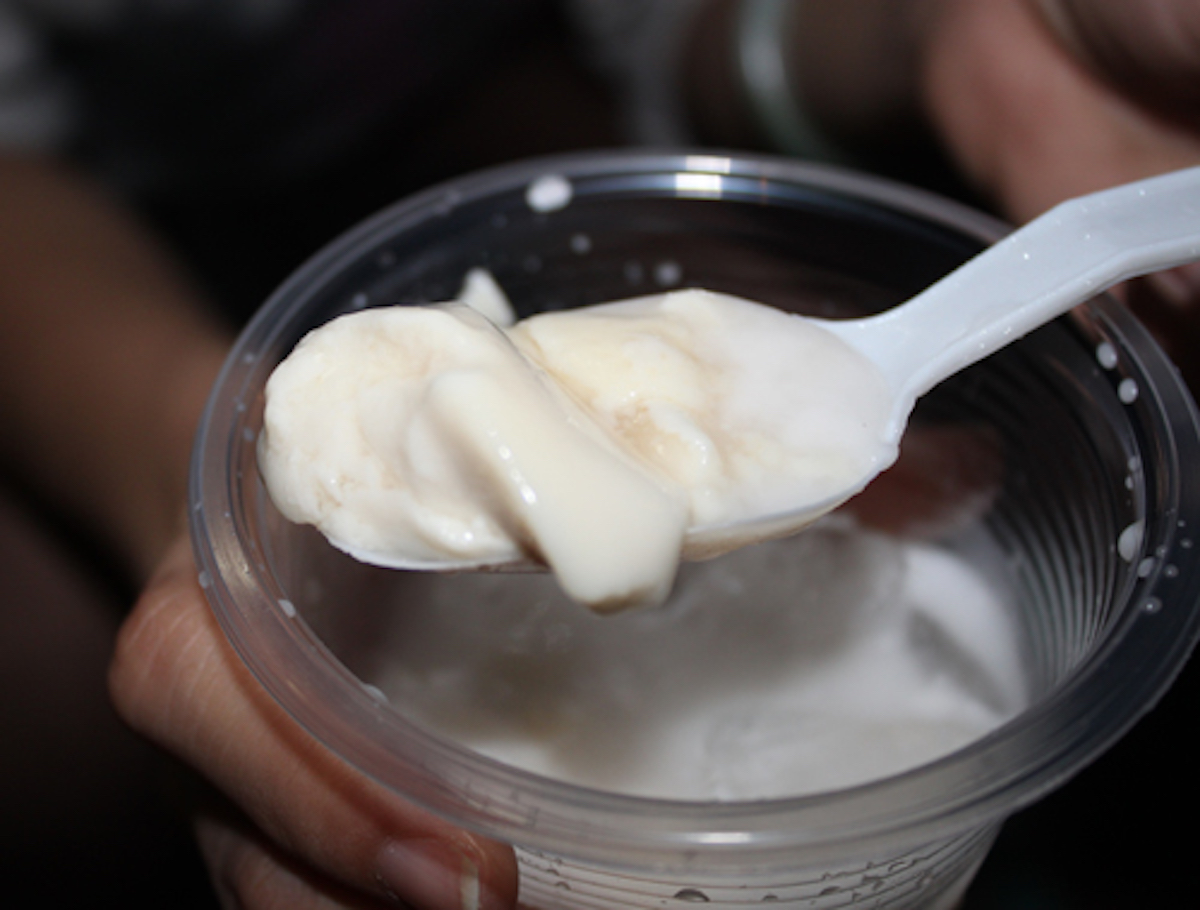 Tàu hũ ở đây có 2 loại, tàu hũ đã cốt dừa và tàu hũ bánh lọt cốt dừa. Tất cả đồng giá 10.000 đồng. Sự kết hợp của nước cốt dừa kèm theo đường trắng, bánh lọt xanh xanh, chút trân châu tự làm đã tạo nên một ly tàu hũ đá có cái béo thơm hòa chút ngọt thanh đầy sảng khoái.