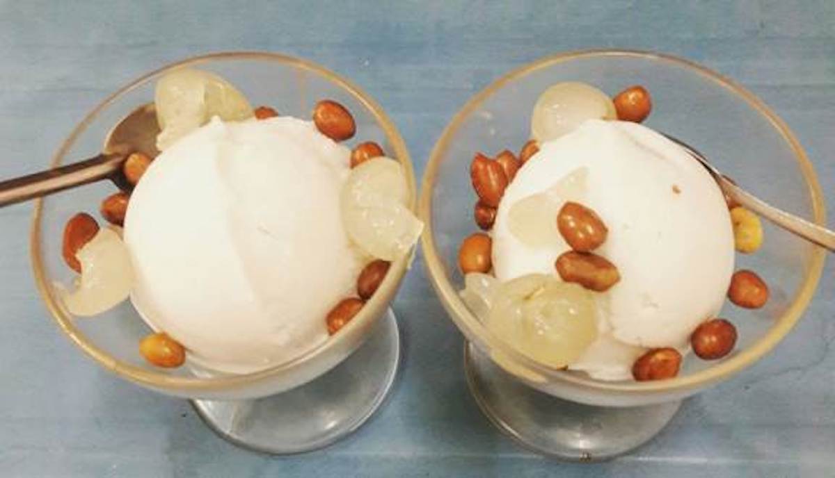 Một ly kem bao gồm viên mát ngọt, ăn kèm thịt nhãn thơm thơm và đậu phộng rang. Phần kem không quá ngọt mang thoang thoảng hương thơm lừng và đậm vị nhãn. Đậu phộng rang bùi bùi cho món đỡ ngấy.