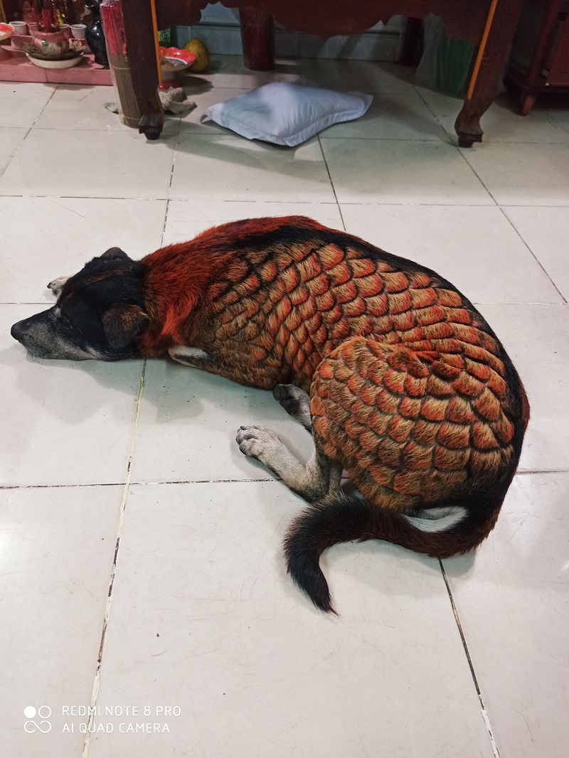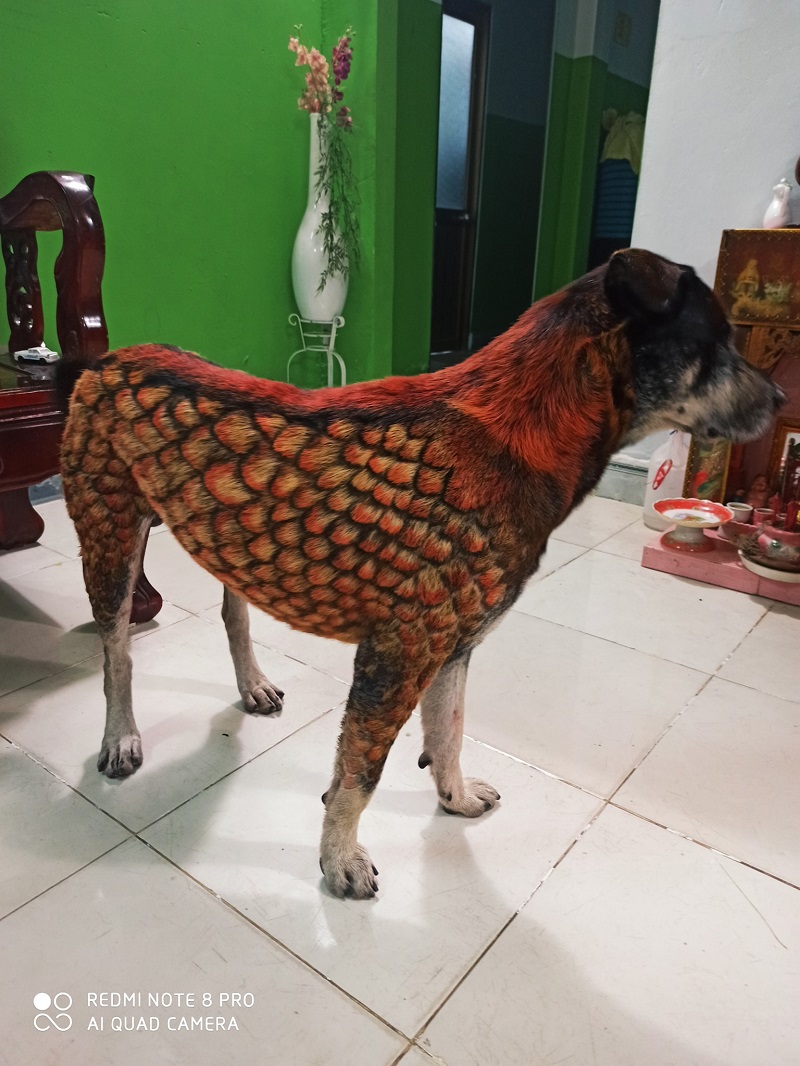 Hình ảnh chú chó bị nhuộm lông để biến thành một con rồng.