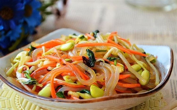 Chần bún rồi cho vào 1 tô lớn, cà rốt thái sợi, hành thái nhỏ và bằm nhuyễn tỏi. Pha nước trộn salad bằng công thức 1/2 muỗng cà phê muối, 2 muỗng cà phê xì dầu, 2 muỗng cà phê dầu mè, 1 muỗng cà phê nước cốt chanh, 2 muỗng cà phê đường, chút hạt tiêu,ớt và rau mùi thái nhỏ rồi rưới lên salad và trộn đều.