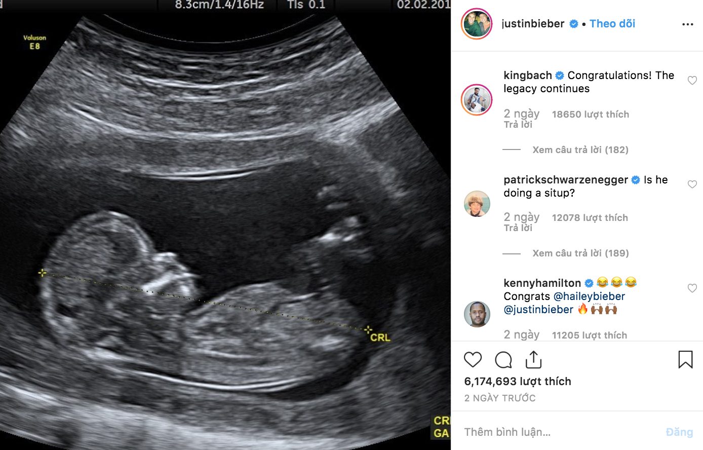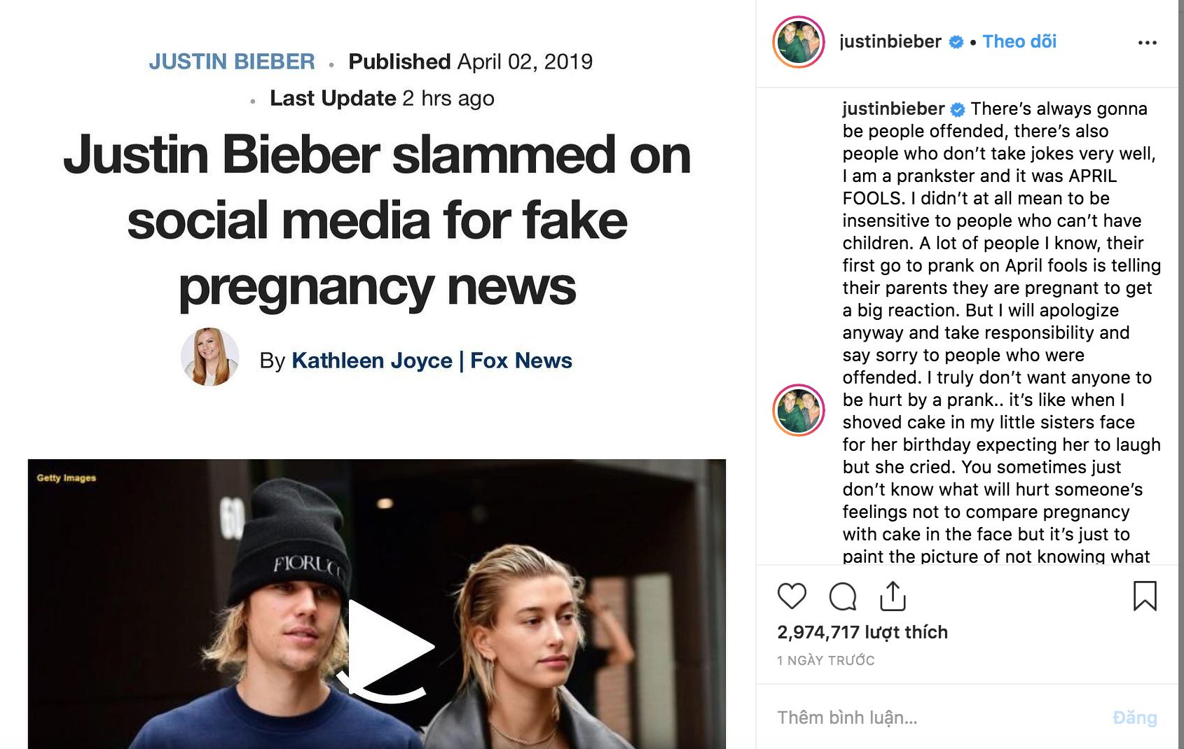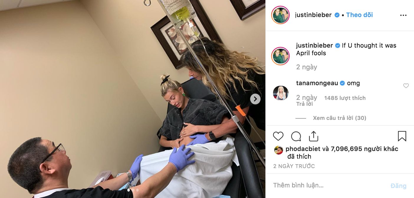 Ngày 1/4, Justin Bieber đánh lừa hàng triệu fan bằng việc đăng tải trên Instagram hình ảnh siêu âm thai nhi và sau đó là hình ảnh cô vợ Hailey đang sờ bụng trong một phòng khám, xung quanh là các nhân viên y tế. Bên dưới phần bình luận, nhiều khán giả và cả một số người nổi tiếng đã gửi lời chúc mừng hai vợ chồng.