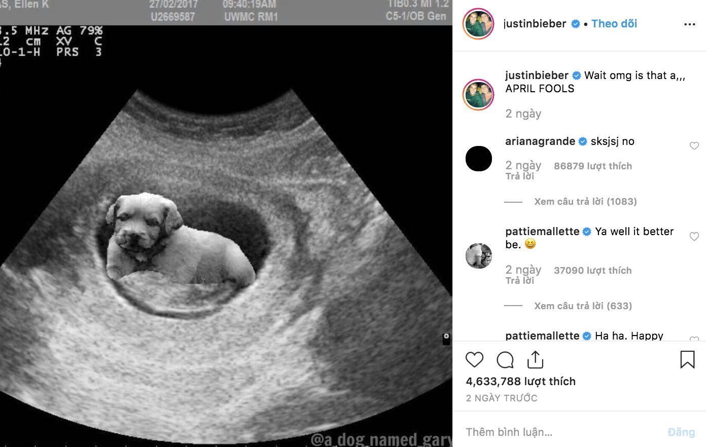 Thế nhưng ngay sau đó, giọng ca “Love Yourself” lại đăng tải hình ảnh siêu âm được chỉnh sửa, hình thai nhi ở giữa được thay thế bằng một chú chó. Anh cũng thừa nhận rằng tất cả chỉ là trò đùa ngày Cá tháng 4.
