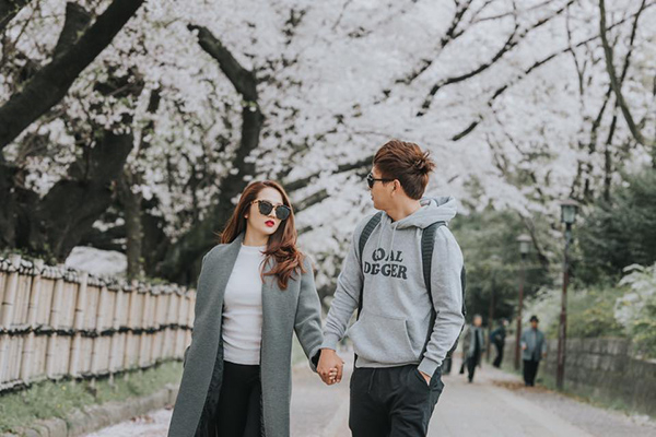 Cả hai nắm chặt tay cùng nhau đi dạo, ngắm hoa anh đào.
