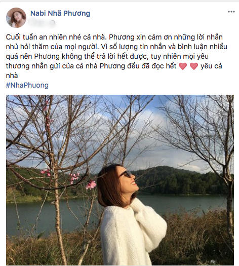 Cô chia sẻ: “Cuối tuần an nhiên nhé cả nhà. Phương xin cảm ơn những lời nhắn nhủ hỏi thăm của mọi người. Vì số lượng tin nhắn và bình luận nhiều quá nên Phương không thể trả lời hết được, tuy nhiên mọi yêu thương nhắn gửi của cả nhà Phương đều đã đọc hết. Yêu cả nhà”.