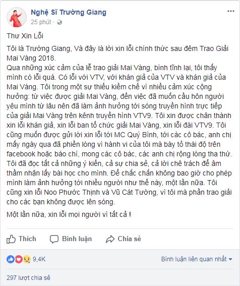 Tôi là Trường Giang, Và đây là lời xin lỗi chính thức sau đêm trao giải Mai Vàng 2018.