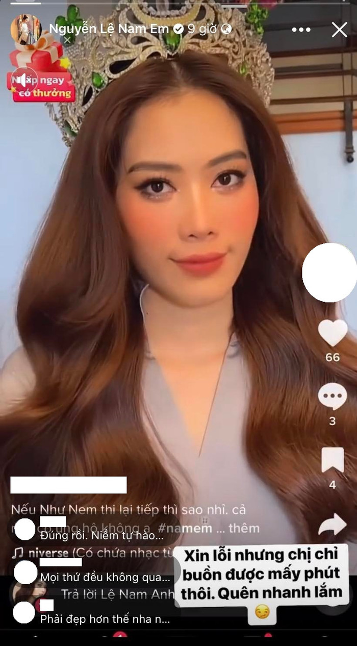 Mới đây trên trang cá nhân, Nam Em đã đăng tải khoảnh khắc chụp cùng vương miện. Đồng thời người đẹp còn khéo léo ẩn ý: "Xin lỗi nhưng chị chỉ buồn được mất phút thôi. Quên nhanh lắm".