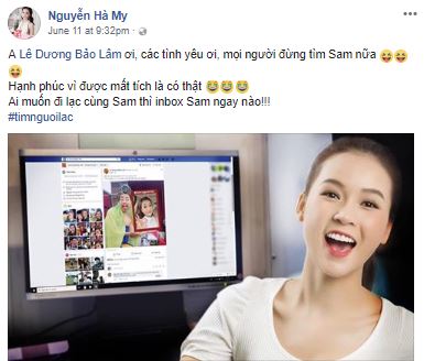 Khi Khởi My, Lê Dương Bảo Lâm tích cực tìm kiếm hot girl Sam thì cô bỗng dưng nhắn gửi đồng nghiệp “các tình yêu ơi, mọi người đừng kiếm Sam nữa”. Khi dân tình còn đang hoang mang, nữ diễn viên còn khẳng định: “Hạnh phúc vì được mất tích là có thật”.
