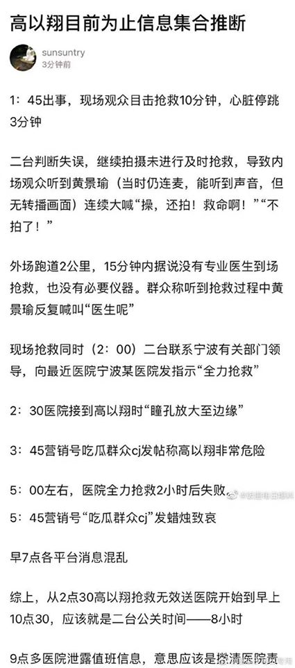 Theo ghi nhận từ hiện trường, khi Cao Dĩ Tường ngã quỵ xuống, nhà sản xuất vẫn tiếp tục ghi hình để lấy hiệu ứng tình cảm cho show. Lúc này, Hoàng Cảnh Du ở cạnh Cao Dĩ Tường hoảng loạn hét lớn: “Các người còn quay nữa hay sao! Mau cứu người!“. Suốt 15 phút sau, tại hiện trường không có lấy một bác sỹ hay nhân viên cứu hộ chuyên nghiệp, Hoàng Cảnh Du không kiềm chế được liên tục kêu gào: “Bác sỹ, bác sỹ đâu!”.