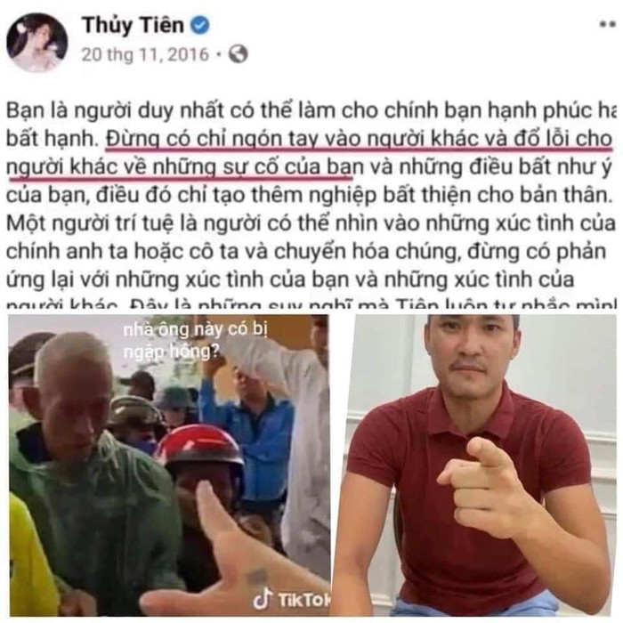 Mới đây, netizen bất ngờ đào bới lại phát ngôn cách đây 5 năm của Thủy Tiên: "Bạn là người duy nhất có thể làm cho chính bạn hạnh phúc hay bất hạnh. Đừng cho chỉ ngón tay vào người khác và đổ lỗi cho người khác về những sự cố của bạn và những điều bất như ý của bạn. Điều đó chỉ tạo thêm nghiệp bất thiện cho bản thân. Một người trí tuệ là người có thể nhìn vào những cảm xúc của chính anh ta hoặc cô ta và chuyển hóa chúng. Đừng có phản ứng lại với những cảm xúc của người khác. Đây là những suy nghĩ mà Tiên luôn tự nhắc mình".