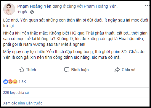'Lúc nhỏ, Yến quan sát những con thằn lằn bị đứt đuôi, ít ngày sau lại mọc đuôi trở lại. Nhiều khi Yến thắc mắc: Không biết Hương Giang qua Thái phẫu thuật, cắt bỏ…thời gian sau có mọc trở lại không ta? Không lẽ, lúc đó không còn gọi là Hoa hậu nữa, phải gọi là Nam vương sao ta? Mệt à nghen!