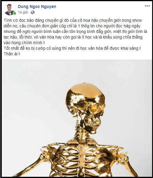 ”Đọc status và các comment cảm thấy nóng máu. Bản thân mình cũng là LGBT, bạn bè mình chuyển giới cũng rất nhiều. Và với những người chuyển giới nam sang nữ, việc bị gọi là Anh ấy, hoặc cái này cái kia mọc lại như thế thì rất là nhạy cảm, thậm chí có tính xúc phạm. Nếu Hương Giang là bạn mình, chắc chắn mình sẽ không để yên khi chứng kiến bạn bè bị miệt thị như thế” - Hoàng Duy nói.