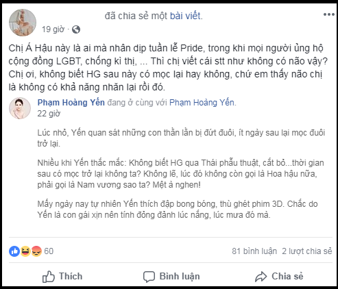 Trên đây là 2 trong số hàng loạt những status, comment mà Á khôi Phạm Hoàng Yến nói về Hương Giang. Và điều này đã khiến cộng đồng LGBT giận dữ.
