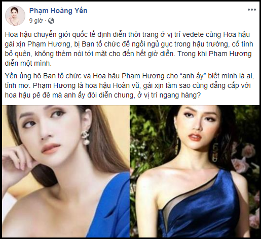 Ngay sau khi sự việc xảy ra, Phạm Hoàng Yến đã cho đăng đàn hàng loạt status nhắm trực tiếp vào Hương Giang và miệt thị giới tính của cô.