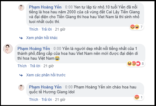 ”Cả thế giới ai cũng công nhận Hương Giang tài giỏi và xinh đẹp biết bao, trong khi ở Việt Nam, đồng nghiệp thì cứ dìm nhau xuống bằng đủ trò bẩn thỉu. Đây là một trong những status kinh tởm nhất mà tôi từng được đọc trong showbiz Không biết cô này nghĩ gì khi phát ngôn như thế nhỉ? Chỉ có thể nói một câu là Không xứng đáng với danh hiệu Á hậu doanh nhân mà cô đạt được” - nickname Lý Liên bày tỏ.