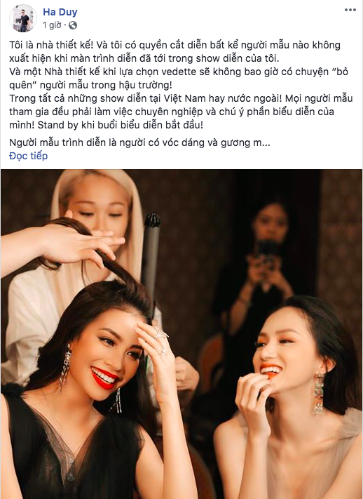 Hôm nay, cả showbiz Việt đều dành sự chú ý cho sự kiện ”Hoa hậu Hương Giang bị bỏ rơi trong hậu trường show diễn của NTK Hà Duy”. Cụ thể, trong đêm diễn ra mắt bộ sưu tập của NTK Hà Duy, HH Hương Giang và HH Phạm Hương được chỉ định là vedette ra trình diễn cuối cùng. Tuy nhiên, cuối show, người ta chỉ thấy Phạm Hương bước ra cùng NTK mà không thấy Hương Giang đâu.