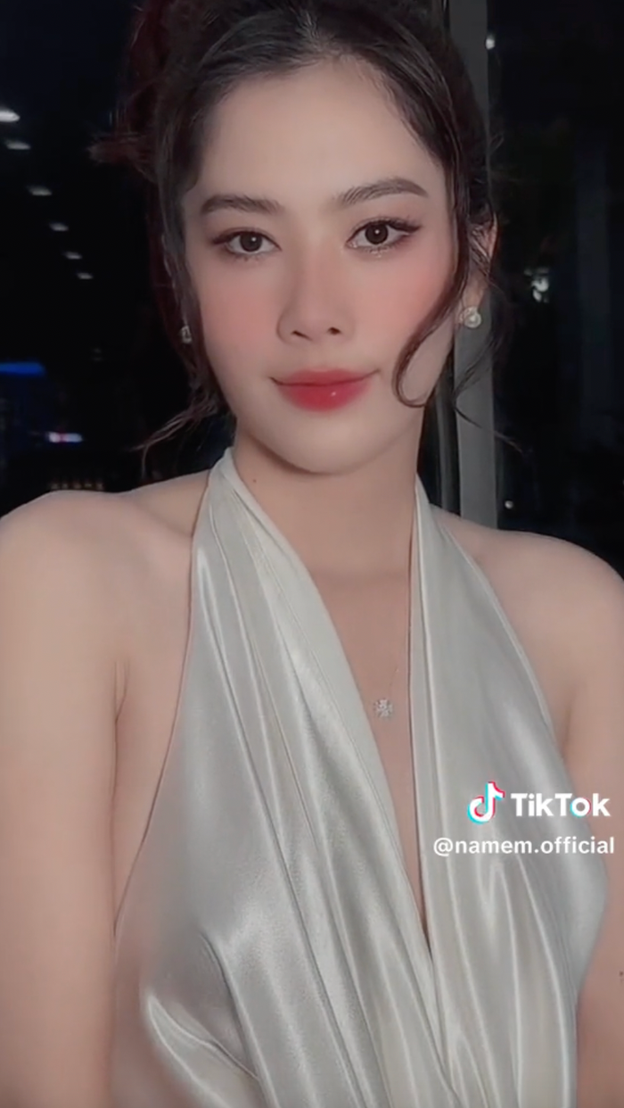 Cô khoác trên người mẫu đầm lụa trắng, có thiết kế cổ yếm trễ ngực. Ngoài ra, chân dài sinh năm 1996 chọn tông trang điểm nhẹ nhàng kết hợp kiểu tóc búi mái xoăn đem lại cảm giác quý phái.