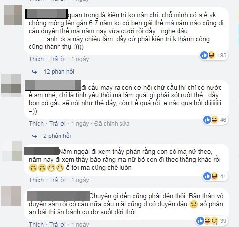 “Mình đọc báo thấy các vị chuyên gia tìm hiểu về Phật giáo đều nói rằng, chỗ cửa chùa không phải là nơi cầu duyên đâu vì chùa chiền là nơi thanh tịnh, kiêng kỵ sắc dục. Vì thế các bạn đi cầu duyên ở chùa, 10 năm vẫn ế là đúng rồi“, một dân mạng lên tiếng.