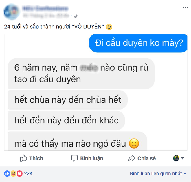 Câu chuyện này được đăng tải trên một trang chia sẻ cộng đồng, ngay lập tức đã nhận được sự quan tâm của nhiều người. Từ đời thực đến trên mạng, ai nấy đều ngán ngẩm vì cảnh cầu duyên nhiều năm mà vẫn vô vọng. Cứ ngỡ rằng chuyện trên mạng chỉ đùa, ai ngờ rất nhiều người cũng bày tỏ thái độ cảm thông với các “chủ thớt” khi họ cũng chính là người đi cầu duyên ròng rã, yêu ai cũng chưa kịp ngỏ lời đã tan vỡ.