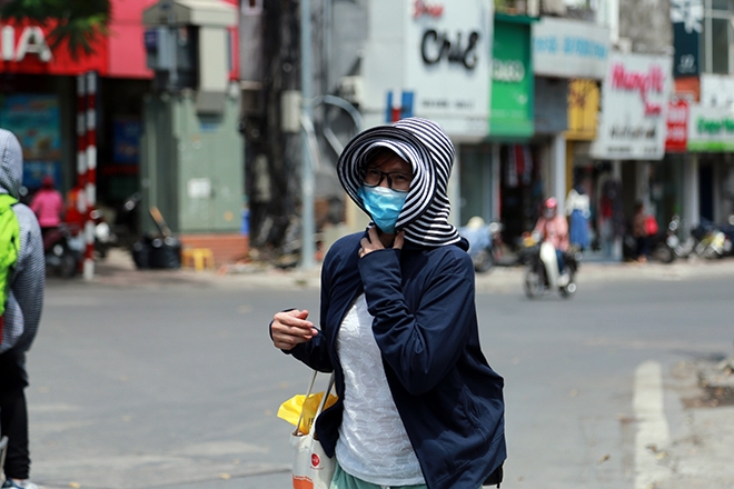 Những người có việc phải ra đường trong thời điểm này thì tìm đủ mọi cách để che chắn từng đợt gió nóng phả vào người.